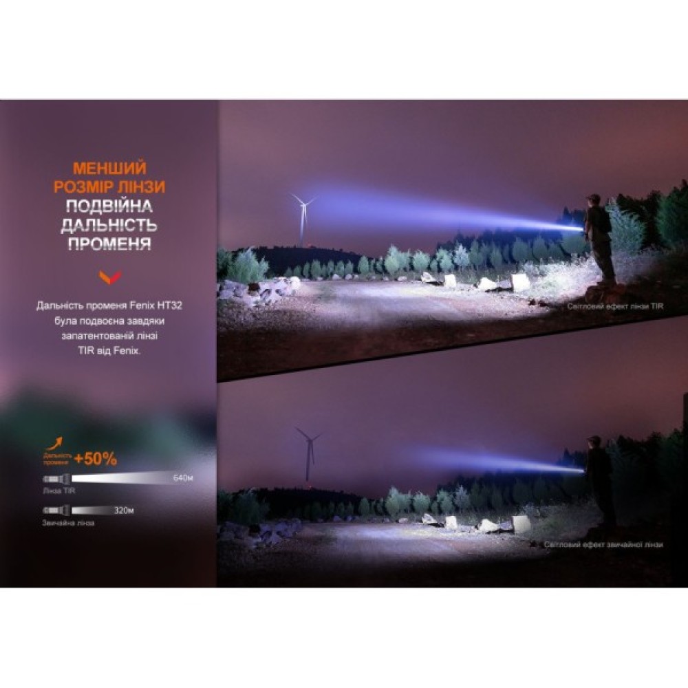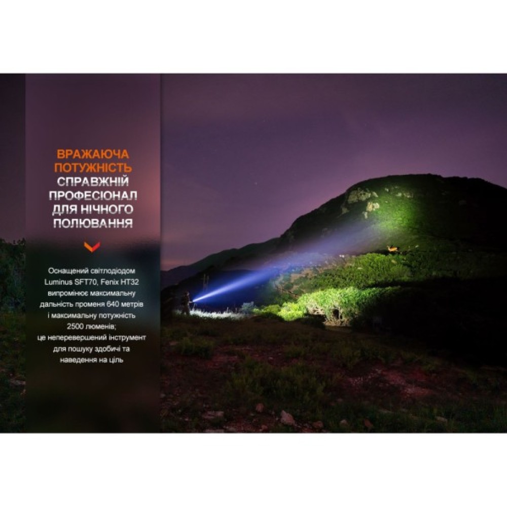 Модель пропонує 9 режимів роботи, включаючи такі популярні, як стробоскоп та турбо. Ергономічний дизайн і чохол, який постачається в комплекті, забезпечують комфортну експлуатацію в будь-яких умовах. Завдяки своїм характеристикам, Fenix HT32 стає ідеальним вибором для полювання, походів та службового використання. Його висока функціональність відмінно доповнюється компактними розмірами — всього 160 мм у довжину та вагою 185 г (без акумулятора), що робить його переносним та зручним у користуванні.