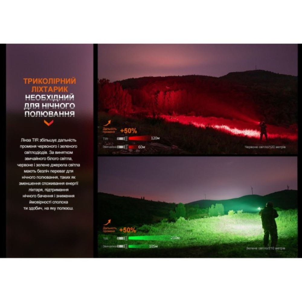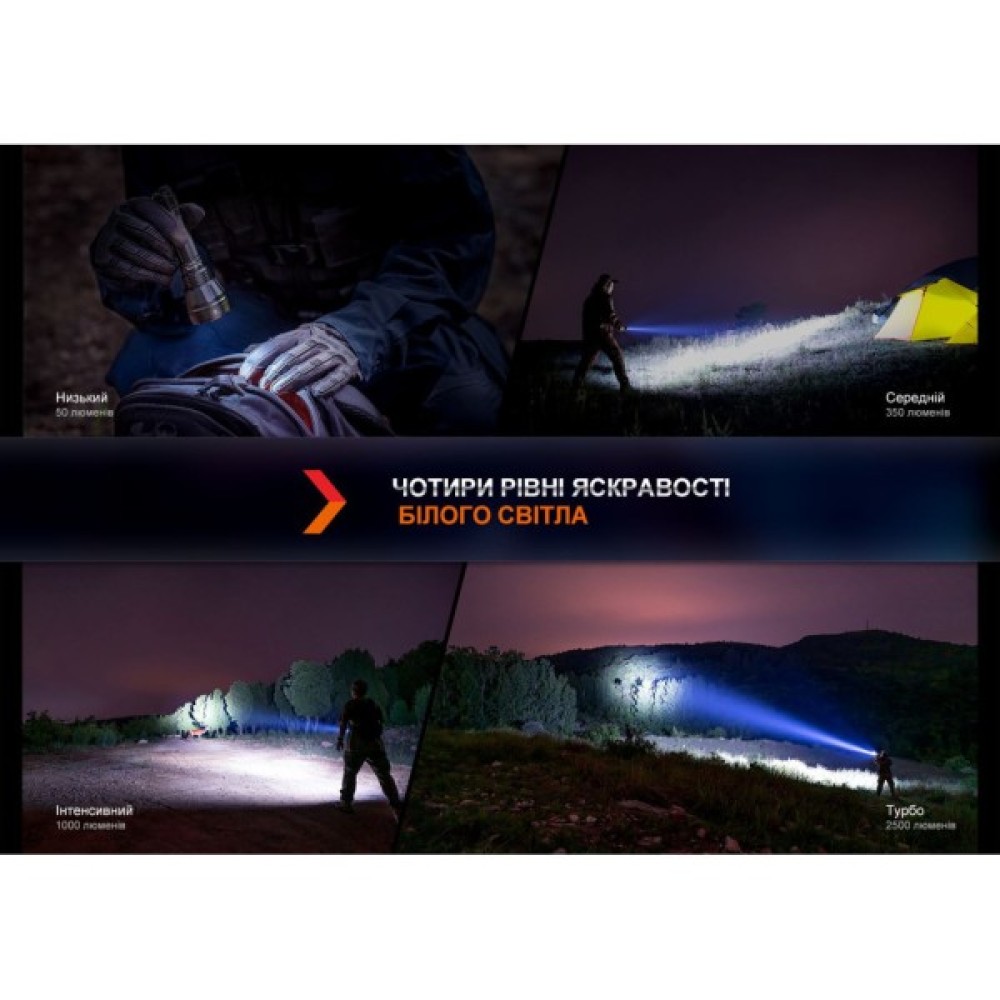 Ліхтар Fenix HT32 — це втілення надійності та інновацій, призначене для справжніх професіоналів та ентузіастів активного відпочинку. Завдяки використанню сучасного джерела світла Luminus SFT70, він здатний випромінювати потужний білий світ з колірною температурою 6500К. Максимальна яскравість досягає вражаючих 2500 люмен, що забезпечує чудову видимість на відстані до 640 метрів. Ліхтар також має можливість генерувати червоне та зелене світло, з граничною яскравістю 400 і 1400 люмен відповідно, що робить його ідеальним рішенням для різних умов.