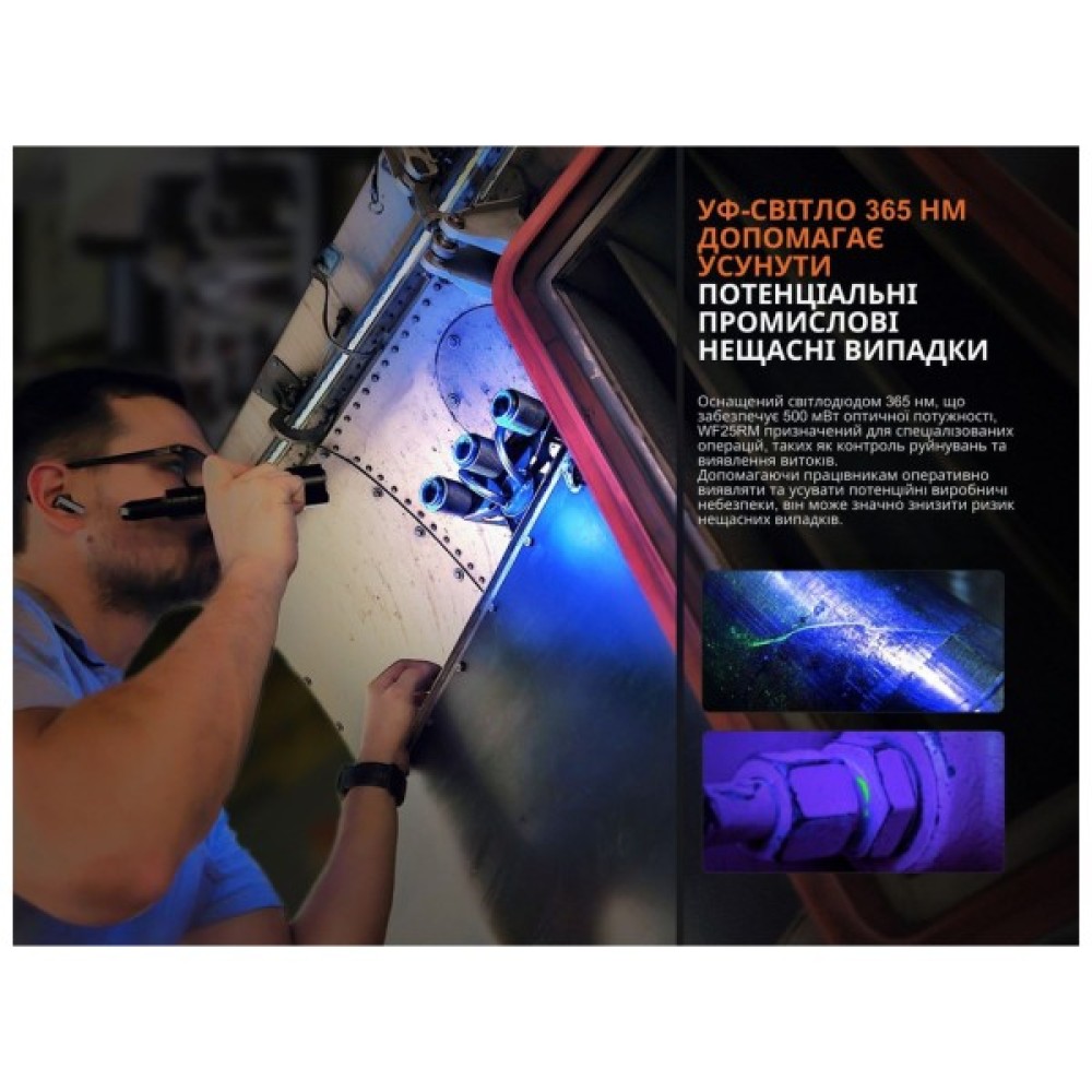 Однією з унікальних особливостей Fenix WF25RM є УФ-режим, який працює на потужності 500 мВт з довжиною хвилі 365 нм. Цей режим дозволяє ефективно використовувати ліхтар для перевірки герметичності, виявлення витоків та інших специфічних завдань у виробничих і технічних умовах.