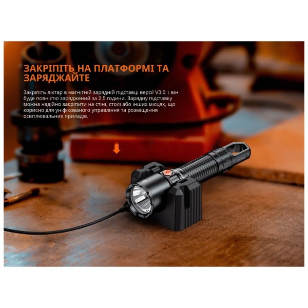 Щодо енергозабезпечення, цей ліхтар використовує акумулятор 21700 з ємністю 5000 мАгод, що гарантує тривалу роботу без потреби в регулярній підзарядці. Зарядка ліхтаря є простою і інтуїтивно зрозумілою завдяки магнітному зарядному кабелю та зарядній станції. Крім того, пристрій оснащений портом USB Type-C, що дозволяє зарядити акумулятор безпосередньо, пропонуючи зручність та гнучкість у використанні.