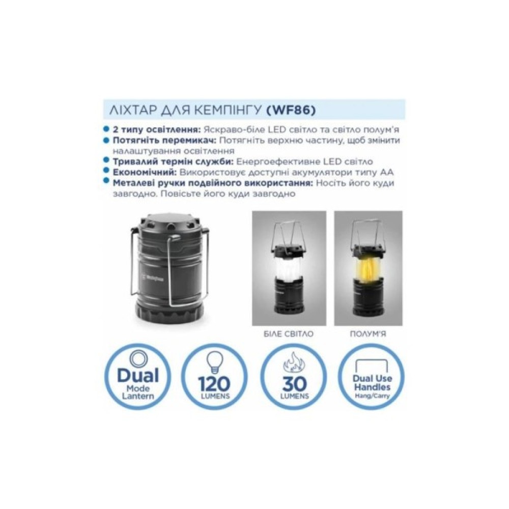 Таким чином, ліхтар Westinghouse WF86 — це не просто освітлювальний прилад, це ваш надійний партнер в активному відпочинку, готовий супроводжувати вас у будь-яких пригодах та забезпечити необхідний комфорт та безпеку на природі. Він поєднує в собі передові технології, зручність та стиль, що робить його відмінним вибором для будь-якого виду діяльності на свіжому повітрі.