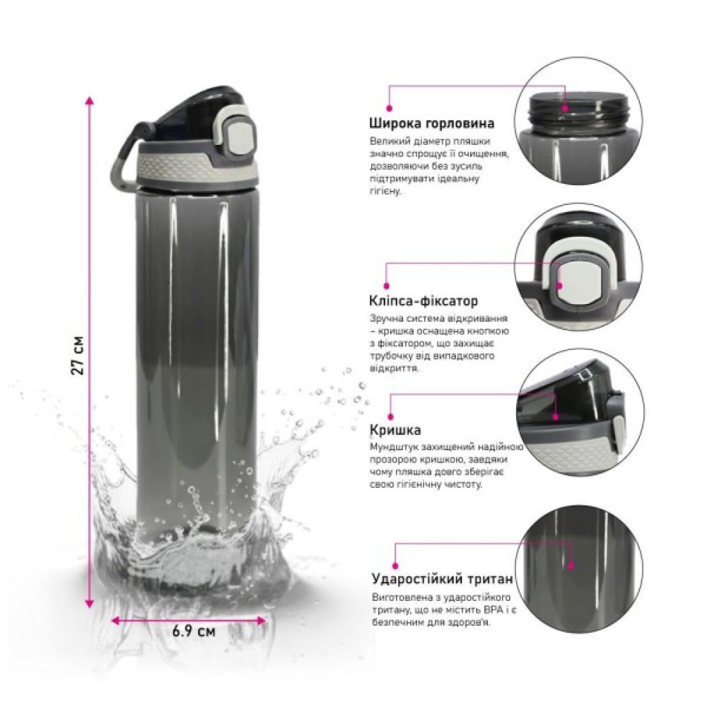 Кришка оснащена кнопкою з фіксатором, що запобігає випадковому відкриванню та забезпечує захист. Має ручку-карабін. Пластиковий носик для пиття з відкидною захисною кришкою забезпечує гігієнічність та зручність під час використання. TPR-вставки на боках кришки забезпечують надійне утримання та комфортне відкривання навіть мокрими руками. Завдяки широкому горлечку пляшка легко миється та швидко наповнюється.