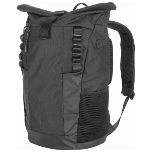 Практичний рюкзак Elbert Rolltop від Schwarzwolf rolltop підходить як для туризму, так і для щоденного використання. Рюкзак декорований чорними смужками з сірою окантовкою. Він має основне внутрішнє відділення з однією окремою кишенею та невеликою кишенею для аксесуарів, передньою маленькою кишенею на блискавці, двома бічними сітчастими кишенями, отвором для навушників і однією маленькою задньою кишенею на блискавці. Після прокатки застібається на пластикову пряжку.