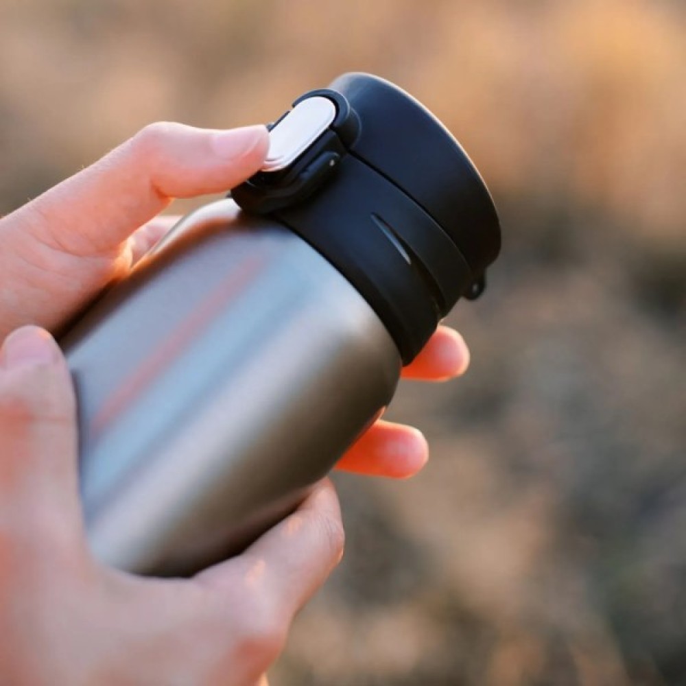 Tribe Motion 0,36 л це компактна двостінна термокружка з харчової нержавіючої сталі SUS 304, розроблена для зручного використання як у місті, так і в дорозі: її легко розмістити в рюкзаку, сумці чи підстаканнику автомобіля, а ергономічна рукоятка забезпечує надійний хват. Кришка з одним натисканням відкривається для пиття, оснащена фіксатором від випадкового проливання та розбірним клапаном для ретельного миття. Завдяки широкому горлу можна додавати кубики льоду, щоб холодний напій довше залишався освіжаючим, а нековзке прорезинене дно гарантує стійкість на гладких поверхнях. Сумісність із неопреновим чохлом Tribe Neoprene Cover T-DF-0006-black робить модель універсальною для будь–яких умов.