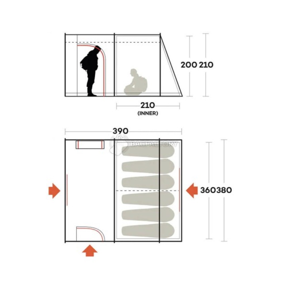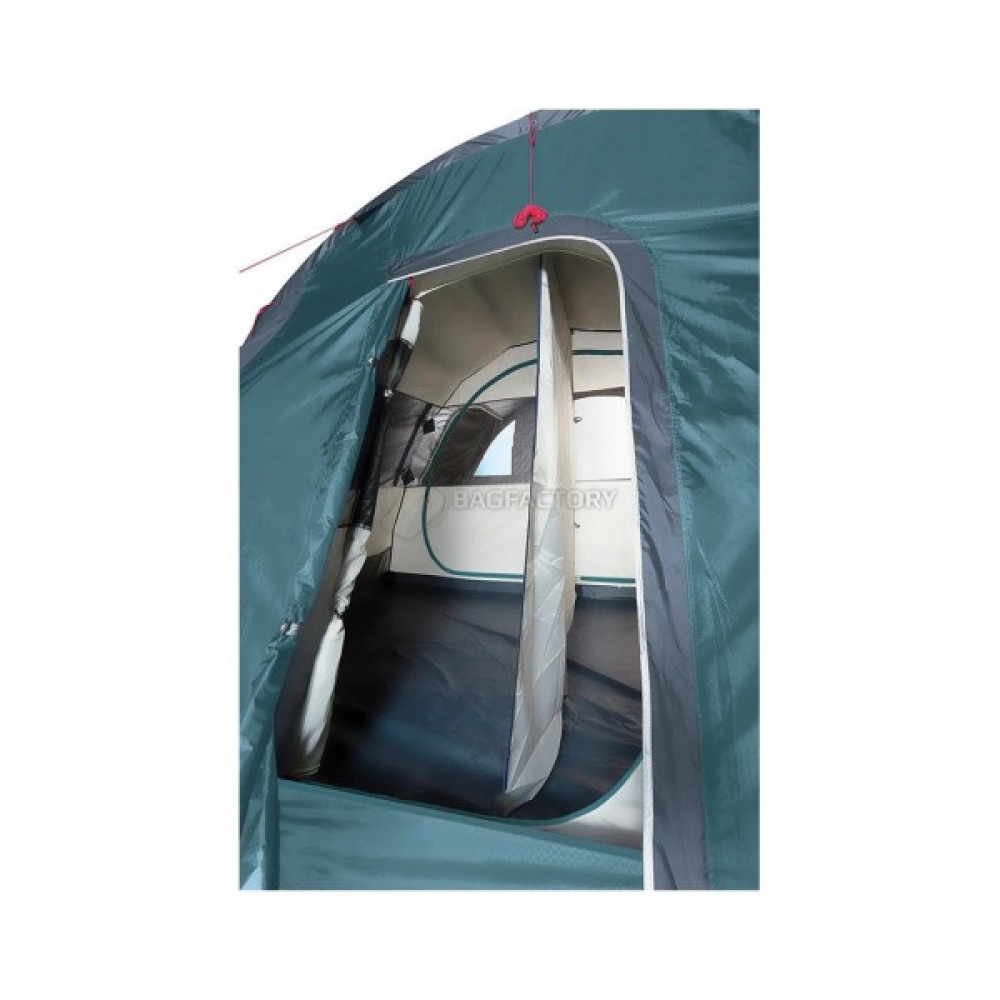 Всі шви герметизуються термостійкою стрічкою для запобігання попаданню води. Тканина намету не горить, а повільно плавиться за прямого контакту з вогнем. Дуги зі скловолокна забезпечують стійкість намету. Потімні стіни внутрішнього намету зменшують проникнення світла, що сприяє гарному сну. Точка кріплення для електричного ліхтаря. Комфортна спальня зі знімною перегородкою розрахована на шістьох людей. Кишені у внутрішньому наметі дозволяють зберігати предмети першої необхідності. Просторий тамбур з повністю вшитою підлогою. Три вхідні двері для зручного доступу. Спеціальний отвір для прокладання електричного кабелю.