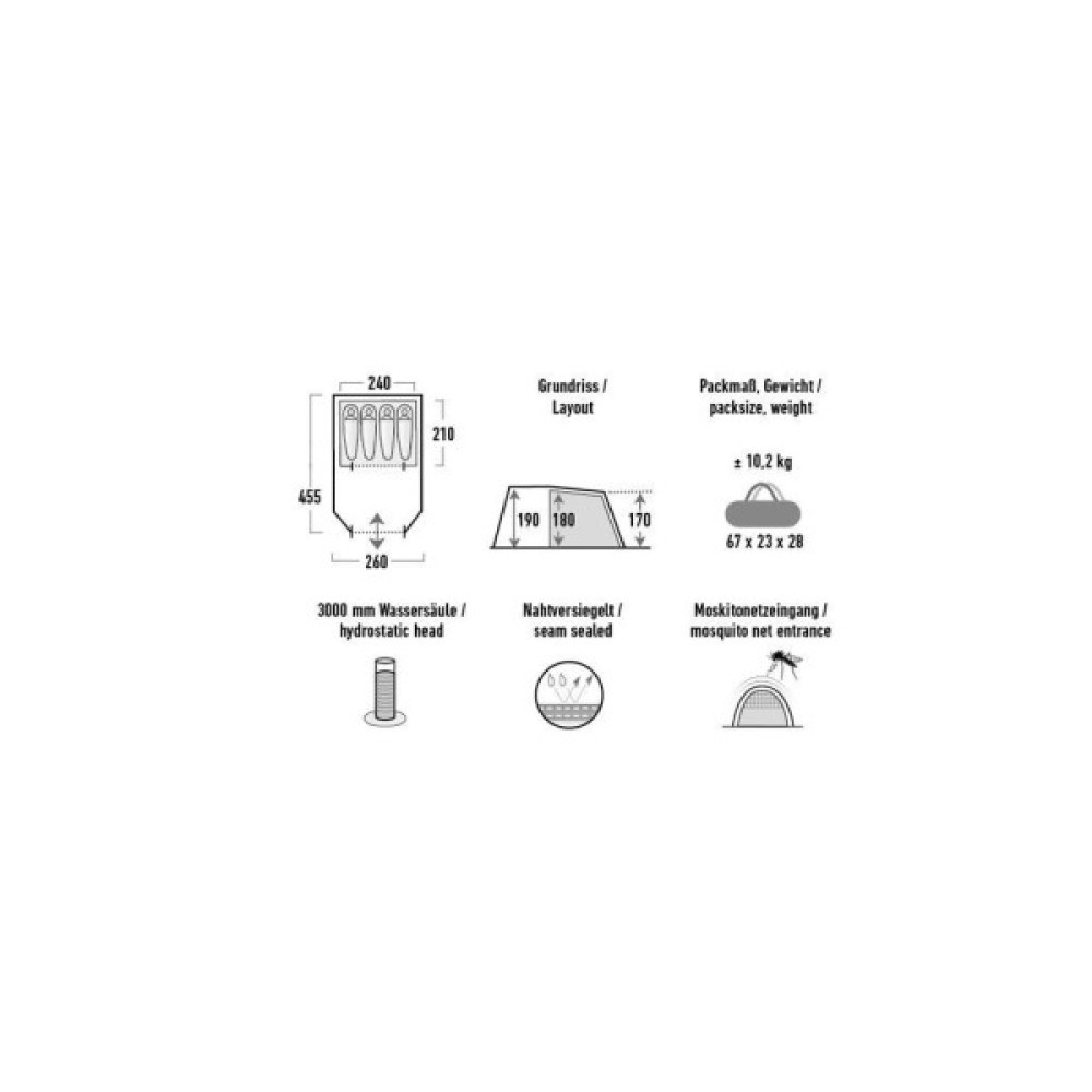• Водостійкість (Hydrostatic Head): 3000 мм в.ст. Водяний стовп надає інформацію про герметичність матеріалу. Щоб визначити міліметрове значення, 10 см тканини розтягують під мірним циліндром, а циліндр наповнюють зверху водою. Межа, за якої краплі води проштовхуються крізь матеріал, називається максимальним водяним стовпом. У Німеччині зовнішній матеріал намету вважається водонепроникним від 1500 мм.