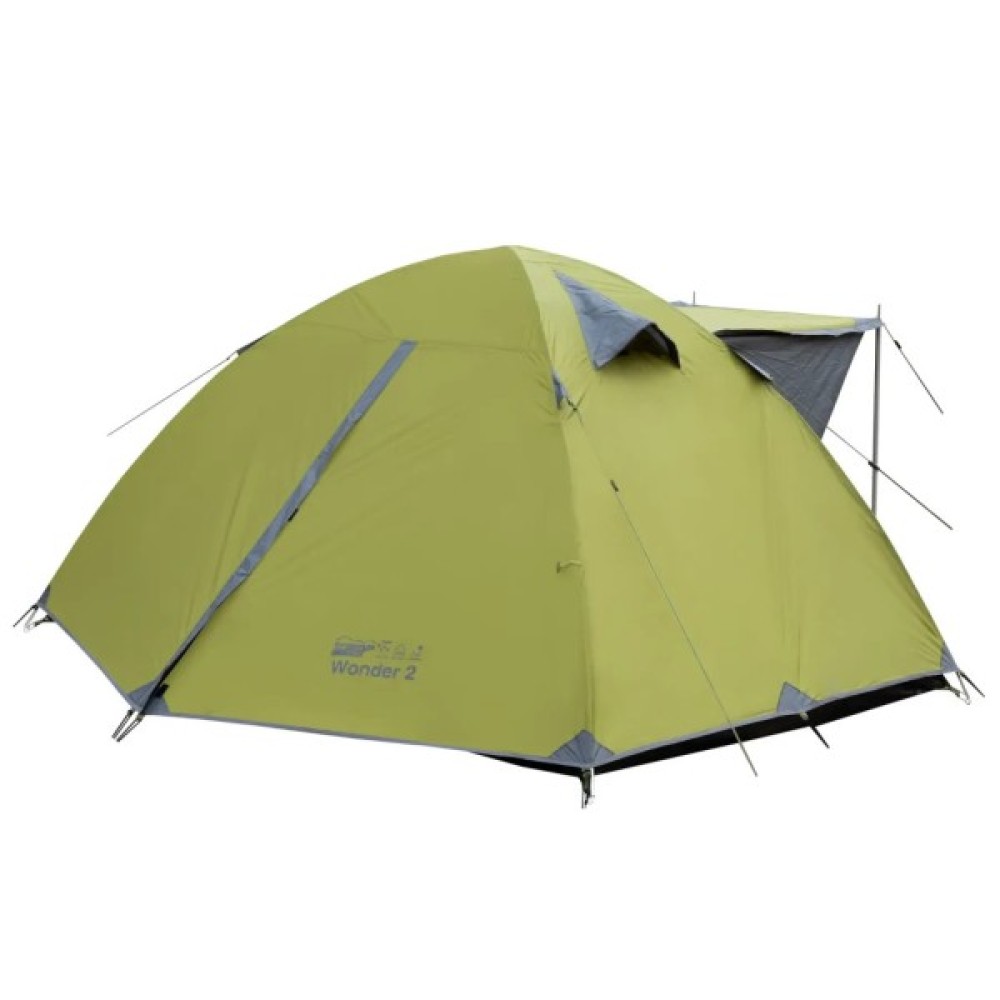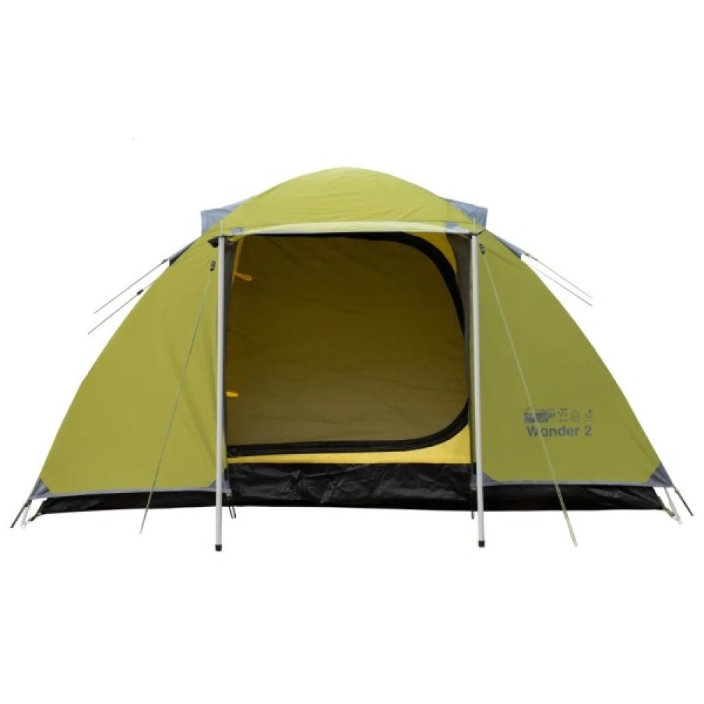 Особливості намету Tramp Wonder 2:- Двошаровий намет - складається з тенту (зовнішня частина намету) і внутрішнього намету (спальне місце). - Каркасна конструкція - міцна, що в свою чергу дозволяє уникнути таких проблем, як перекіс і деформації в процесі експлуатації.- Матеріал каркаса фіберглас - пластичний матеріал, що складається з скловолокнистого наповнювача, скріпленого синтетичною смолою, який характеризується міцністю і легкістю.- Можливість підняти двері і утворити тент при вході.- Намет має 2 вентиляційних клапана.- Всі шви намету проклеєні і герметизовані за допомогою термозбіжної водонепроникної стрічки. - Вхід в спальне відділення продубльований москітною сіткою, яка служить, як захист від комах і в якості додаткової вентиляції.
