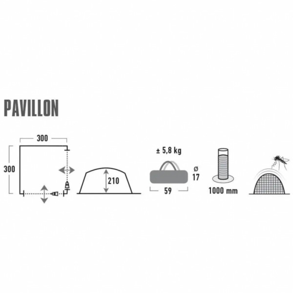 Павільйон High Peak Pavillon Light Grey/Dark Grey/Lime забезпечує чудовий захист від сонця і вітру. 2 сітчасті стінки на блискавці захищають від настирливих комах, а 2 тканинні стінки захищають від негоди в разі дощу. Конструкція каркаса з куточками з АBS-пластику має достатню висоту для оптимального використання внутрішнього простору. Мала вага, невеликий розмір паковання та швидке збирання роблять павільйон ідеальним для проведення вечірок і фестивалів.