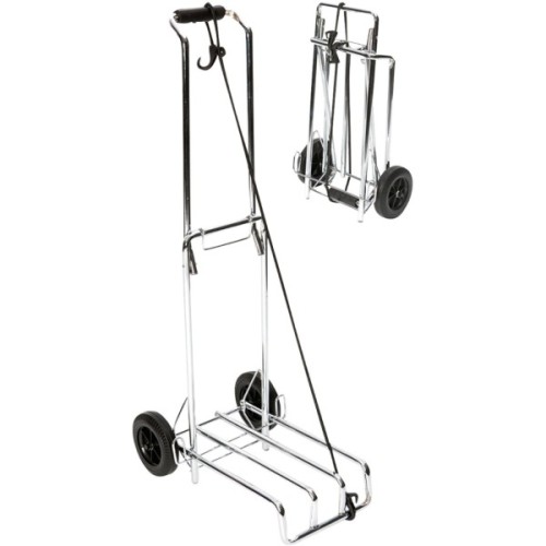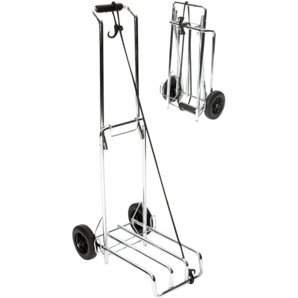 Bo-Camp Luggage Trolley Foldable виготовлена ​​із міцної хромованої сталі, що гарантує надійність та тривалий термін експлуатації. Зручна ручка висотою 100 см забезпечить комфортне транспортування вантажу, а великі колеса діаметром 14 см дозволять легко переміщати візок навіть нерівними поверхнями. Розмір платформи для багажу 26х40 см забезпечує достатньо місця для різноманітних предметів, а розміри у складеному стані роблять візок ідеальним для зберігання в автомобілі, гаражі або навіть вдома. У комплекті з візком поставляється еластична стяжка для багажу довжиною 150 см, яка допоможе ще надійніше закріпити вантажну платформу.