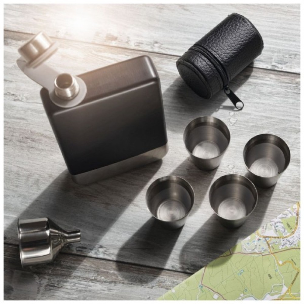 • Включає: чорну флягу з нержавіючої сталі, 4 чарки 30 мл в чорному чохлі, лійка