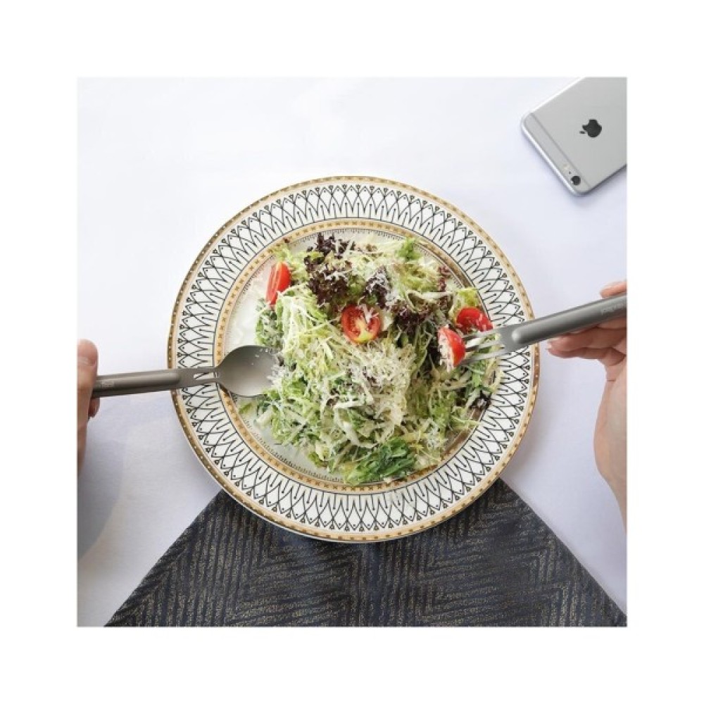Компактний і міцний набір з ложки і виделки. Зручний в застосуванні, ергономічний. Лаконічний дизайн, в основі - надійний титан (зміст: 99%). Захист від корозії. Вага становить 27 грам. Розміри ложки: довжина - 16 сантиметрів, а ширина головки становить 3,54 сантиметра. Довжина вилки досягає 13,9 сантиметра, а ширина – 1,73 сантиметра.