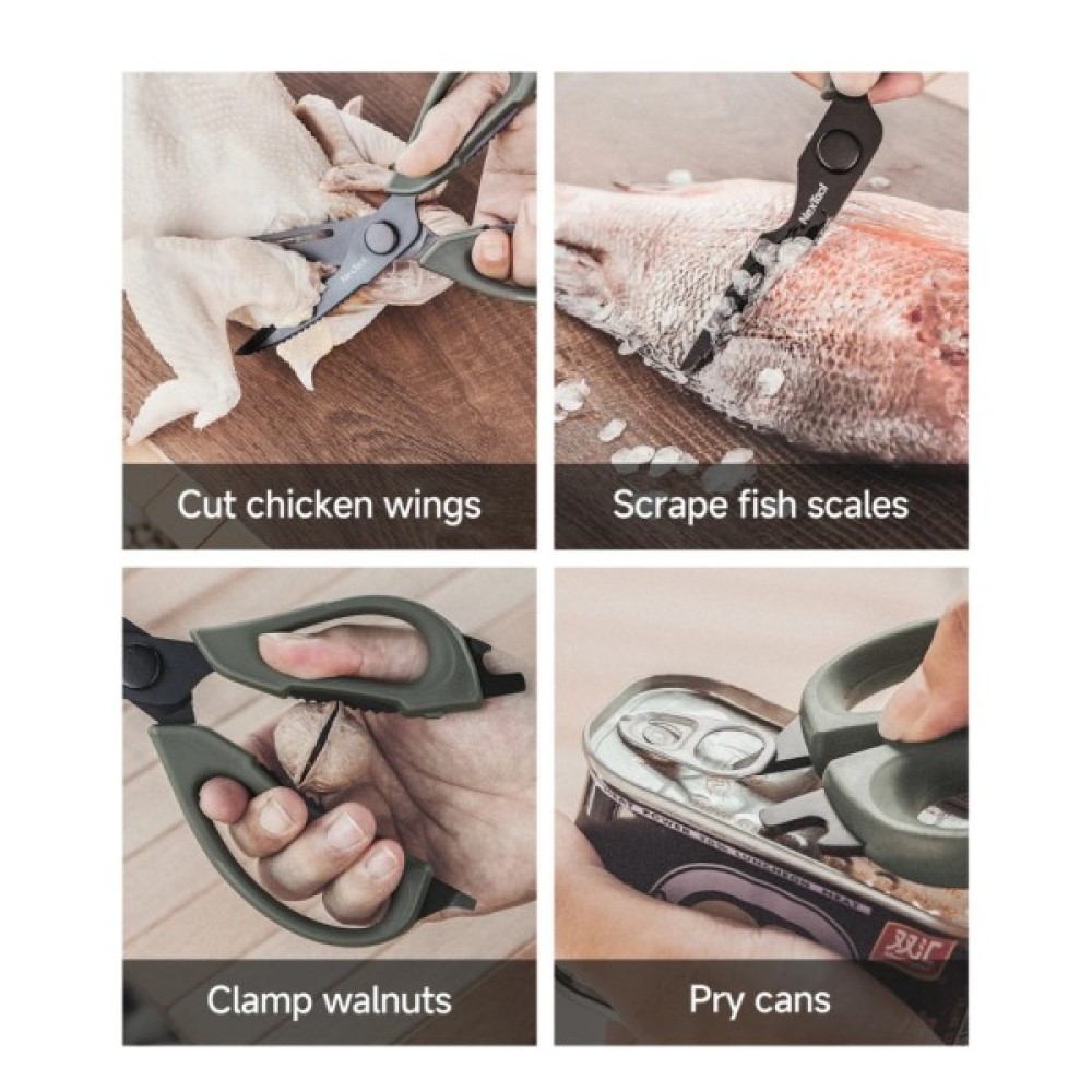 • Ножиці зі сталі 3Cr13 з поліпропіленовим руківʼям (PP). Ножиці мають швидкознімний механізм і відрізняються універсальністю: вони підходять і для обробки продуктів, і для розкриття паковань.