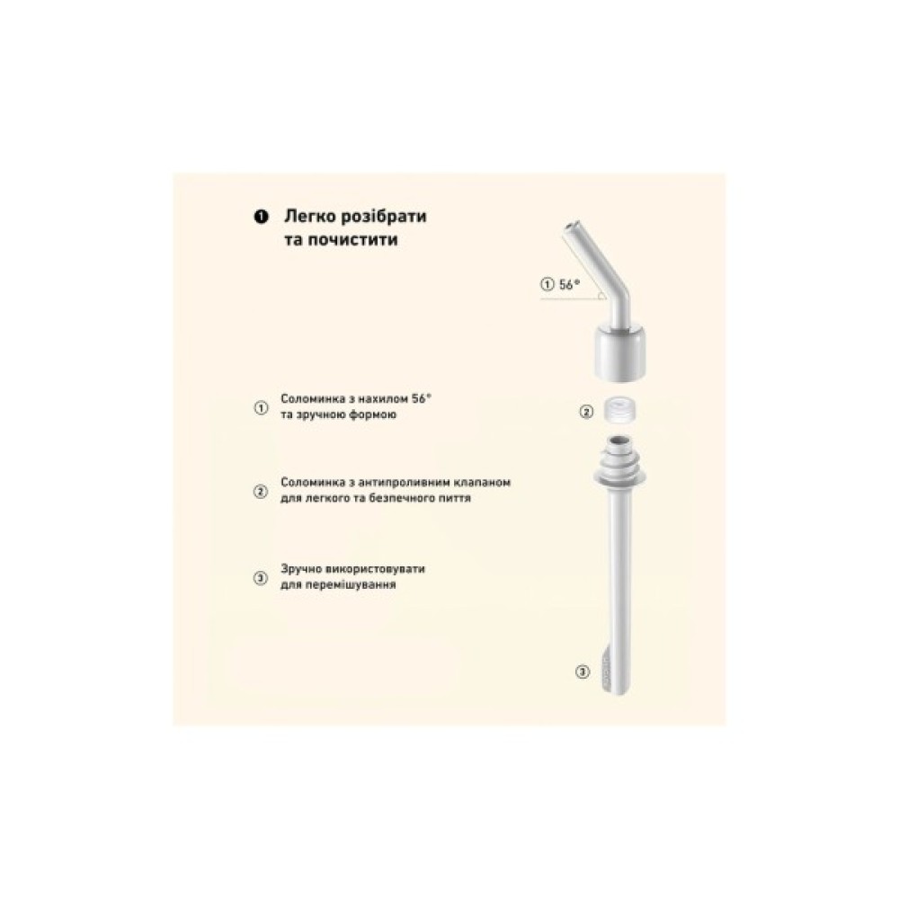 Пляшка оснащена пластиковою соломинкою, що дозволяє зручно пити без нахилу, що ідеально підходить під час поїздок або тренувань. Соломинка виготовлена ​​із безпечного матеріалу без BPA, не впливає на смак та здоров'я. Вона легко чиститься, забезпечуючи гігієнічне використання. Кришка герметична, запобігає проливанню, але зручна для відкривання та закривання.