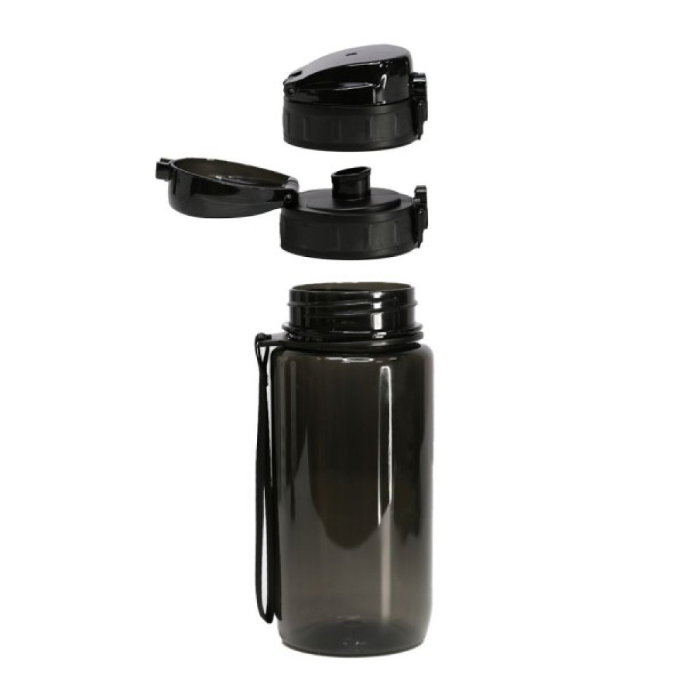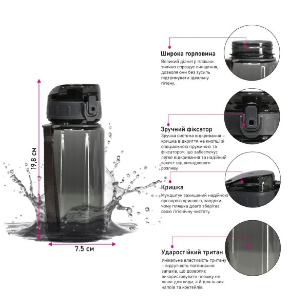 Кришка оснащена кнопкою з фіксатором та пружиною, що запобігає випадковому відкриванню та забезпечує надійний захист від протікання. Пластиковий носик для пиття з відкидною захисною кришкою забезпечує гігієнічність та зручність під час використання у спортзалі, офісі чи на вулиці. Вставки на боках кришки забезпечують комфортне відкривання навіть мокрими руками. Завдяки широкому горлечку пляшка легко миється та швидко наповнюється.