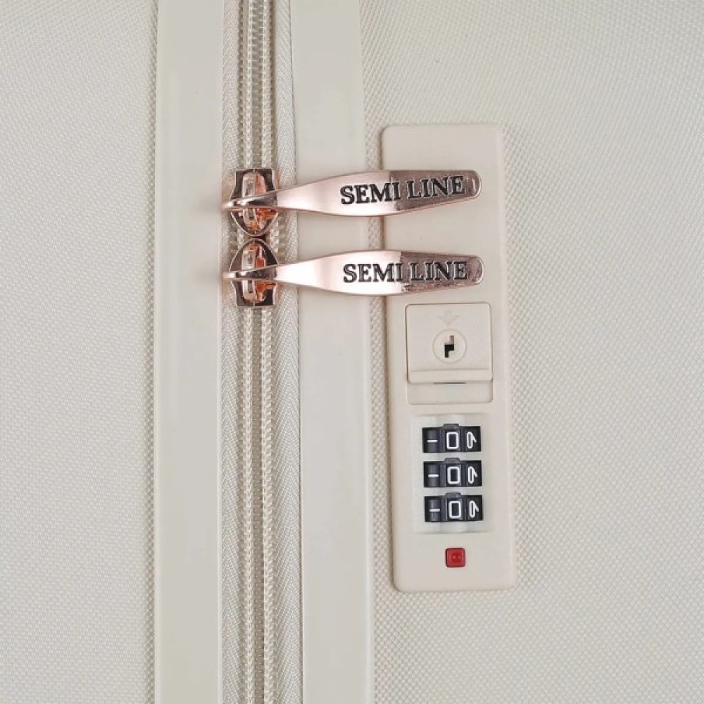 Валіза Semi Line T5786 має дизайн із заокругленими кутами та локонічним візерунком на фасаді, завдяки чому виглядає лаконічно і охайно. Вона оснащена легкою алюмінієвою телескопічною ручкою, що фіксується в трьох положеннях, а ручки для перенесення валізи в руках виконані з приємного на дотик пластику Soft-Touch. "Утоплений" кодовий замок покликаний захистити вміст вашої валізи, а також не виступає над корпусом, отже його неможливо випадково пошкодити при транспортуванні валізи.