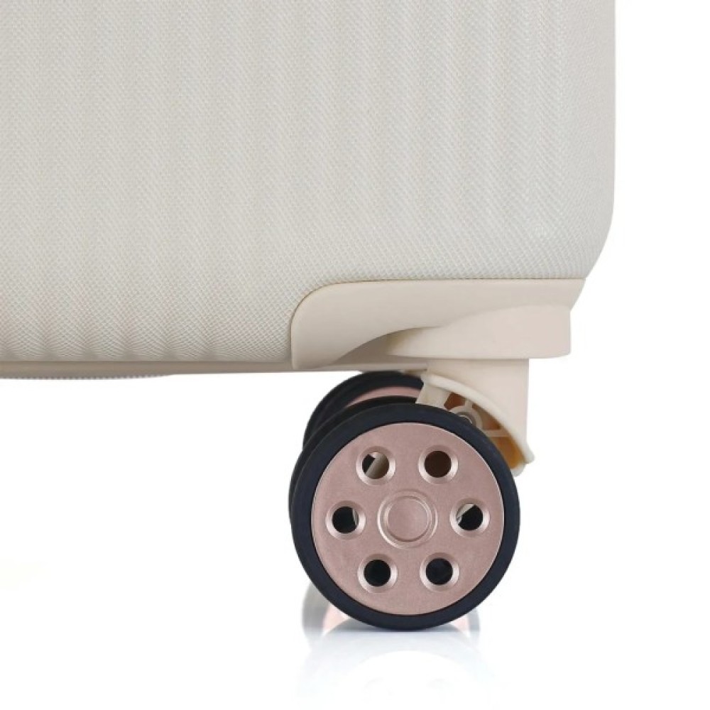 • Повноповоротні колеса - дана модель оснащена чотирма обертовими на 360 ° здвоєними колесами. Здвоєні колеса забезпечують кращий розподіл ваги та стійкість валізи, відмінне зчеплення, маневреність та мають більшу зносостійкість. Колеса кріпляться на 4 гвинти зсередини, що забезпечує високу стійкість при ударному навантаженні з будь-якого боку і дозволяє їх замінити у разі зносу.