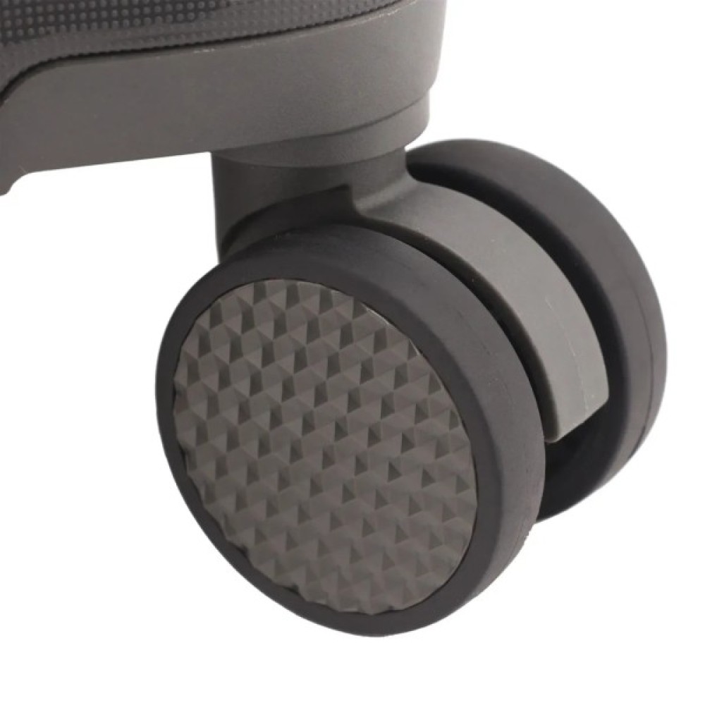 • Подвійні колеса - дана модель оснащена чотирма обертовими на 360 ° здвоєними колесами. Здвоєні колеса забезпечують кращий розподіл ваги та стійкість валізи, відмінне зчеплення, маневреність та мають більшу зносостійкість. Колеса кріпляться гвинтами зсередини, що дозволяє їх замінити у разі зносу.