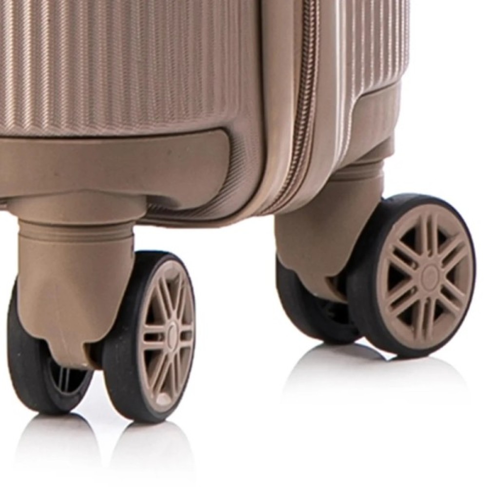 • Повноповоротні колеса - дана модель оснащена чотирма обертовими на 360 ° здвоєними колесами. Здвоєні колеса забезпечують кращий розподіл ваги та стійкість валізи, відмінне зчеплення, маневреність та мають більшу зносостійкість. Колеса кріпляться на 4 гвинти зсередини, що забезпечує високу стійкість при ударному навантаженні з будь-якого боку і дозволяє їх замінити у разі зносу.