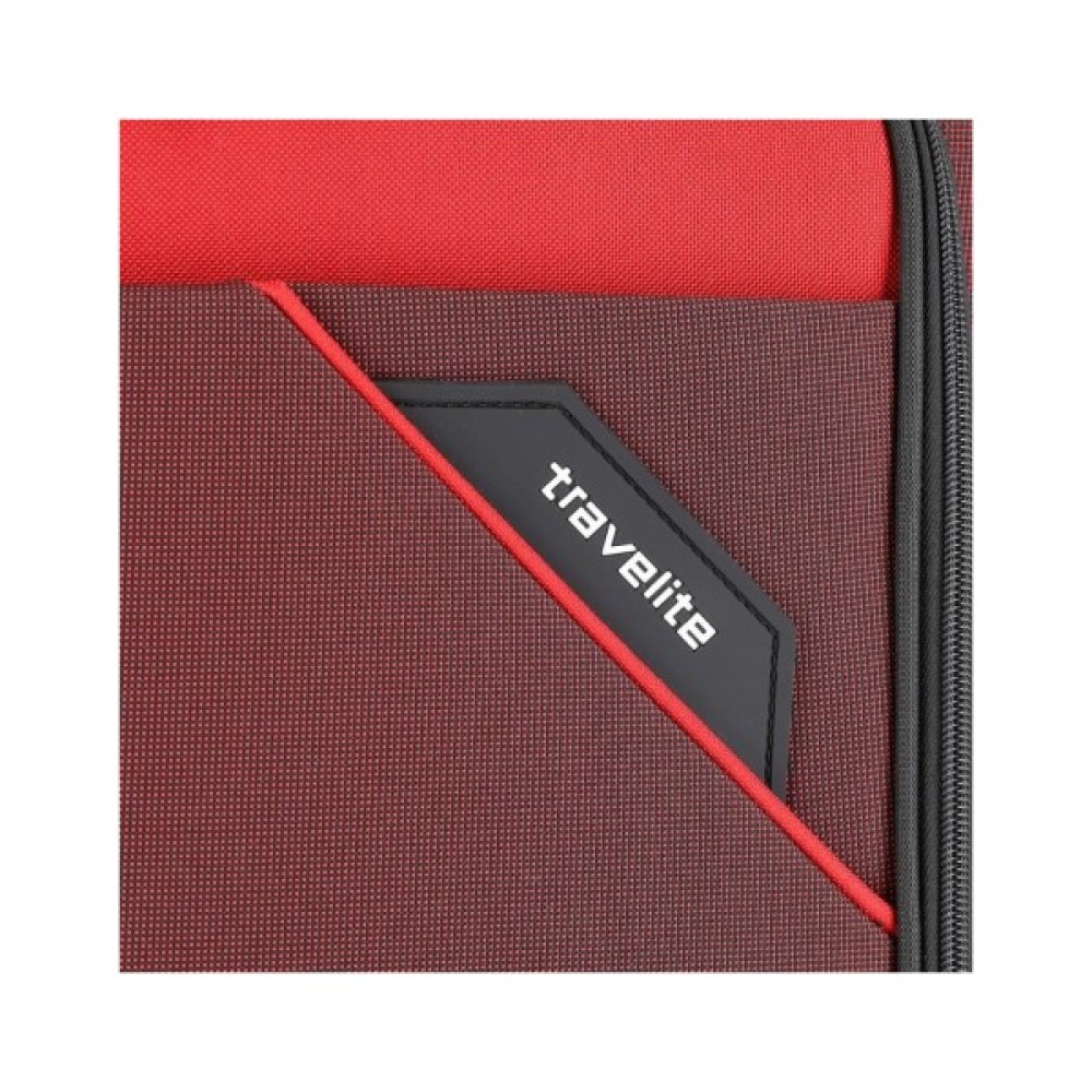 Валіза прикрашена назвою бренду Travelite білим кольором.