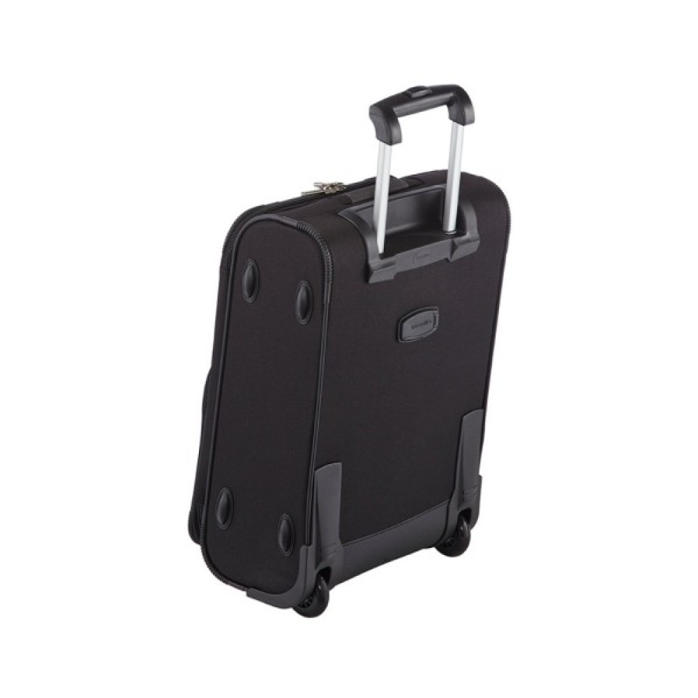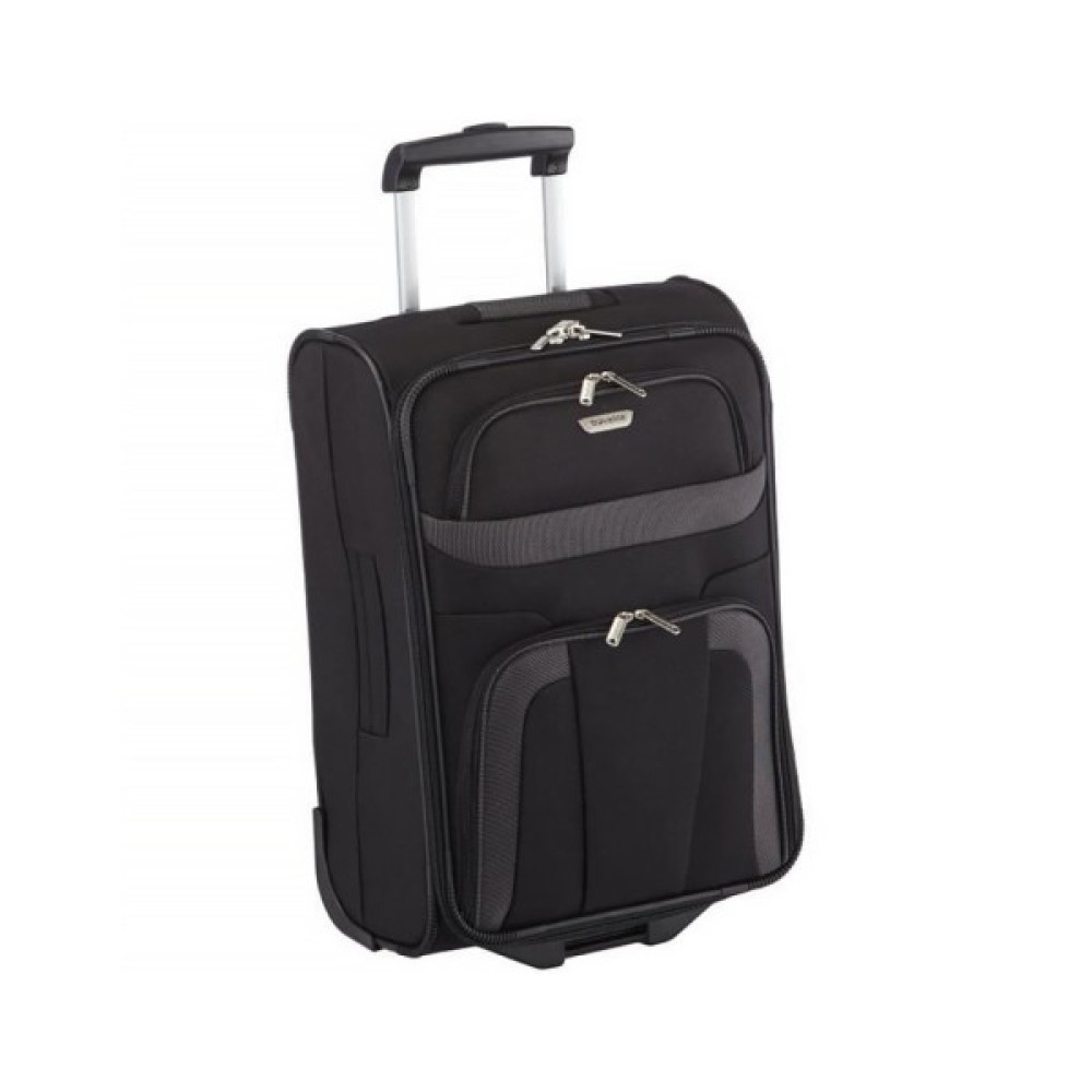 Маленька валіза для ручної поклажі. Чудово продуманий дизайн, практичний темно-сірий колір та оригінальні форми в м'якому корпусі. Ретельно організований внутрішній простір - одне велике відділення для речей і відсіки на блискавці для сорочок, журналів, туалетного приладдя. На лицьовій частині розташувалися дві автономні кишені на блискавці. Виготовлений з міцного поліестеру, стійкого до розривів і деформацій. Має два безшумних колеса. Для зручного пересування є дві широкі ручки і одна висувна (телескопічна).