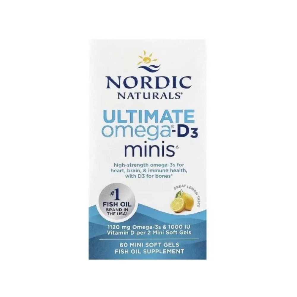 Основні переваги: Омега-3 та вітамін D3, 1120 мг та 25 мкг (1000 МО), смак лимона, Ultimate Omega-D3 Minis, Nordic Naturals, 60 міні капсул