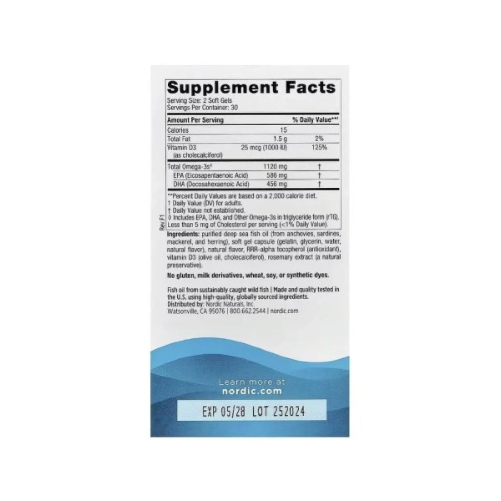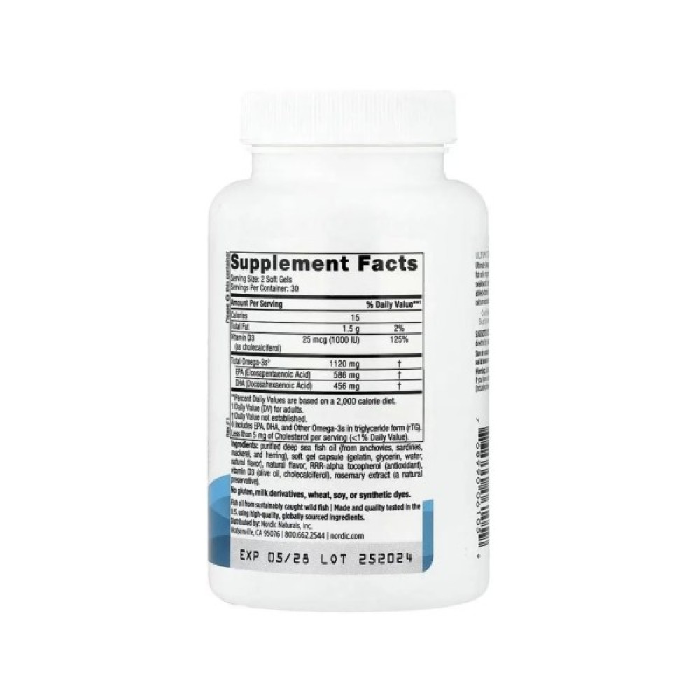 Продукт має високу якість інгредієнтів. Омега-3 посилена вітаміном D3, що робить формулу ще ефективнішою, оскільки вітамін D3 бере участь у більш ніж 2000 процесах організму. Дефіцит вітаміну D3 викликає загальне нездужання, хронічну втому та проблеми з кістками. Nordic Naturals виробляє риб'ячий жир із свіжої дикої риби, що підвищує ефективність продукту. Міні-капсули зручні для вживання.