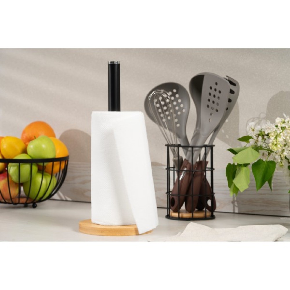 Функціональний і стильний тримач для паперових рушників ARDESTO Midori є аксесуаром, який зробить повсякдення на кухні зручним і організованим. Конструкція з металу чорного кольору та бамбуковою основою не займе багато місця на столі. Мити виріб в посудомийній машині не можна.