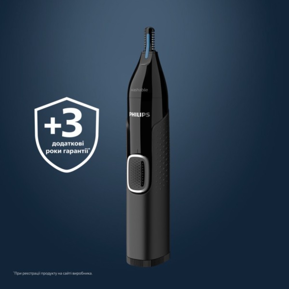 Тример для носа Philips серії 5000 дбайливо видаляє волосся в носі та вухах, а також дає змогу підстригати брови та створювати точні контури. Нова технологія PrecisionTrim і система Protective Guard забезпечують просте й ефективне підрівнювання без висмикування волосинок.