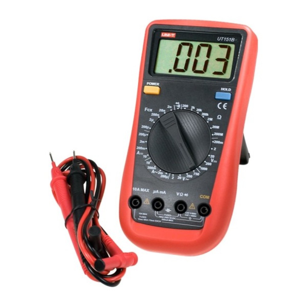UNI-T UT151C – це цифровий мультиметр з ручним вибором діапазону, призначений для вимірювання постійної та змінної напруги, постійного та змінного струму, опору, ємності, температури, а також тестування діодів та провідності кола.