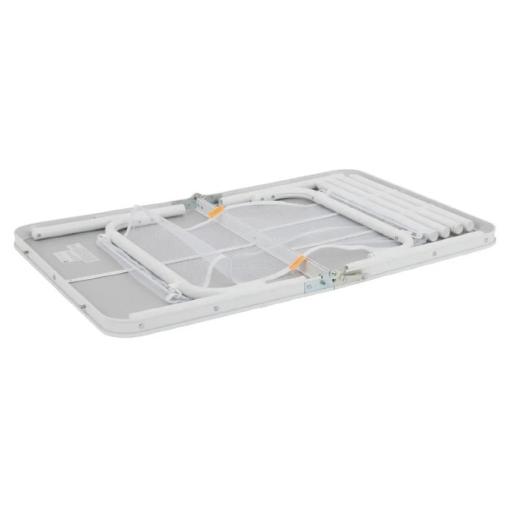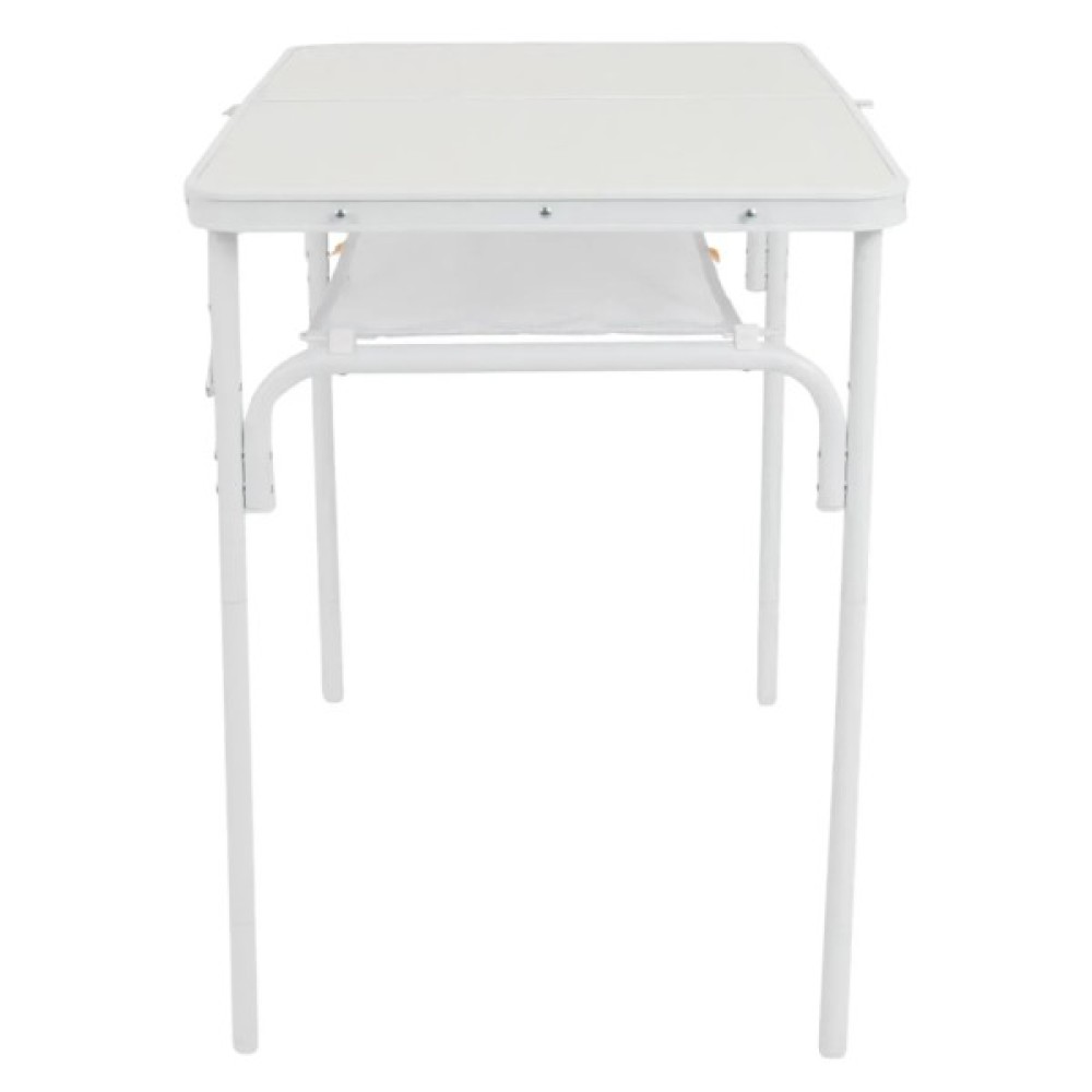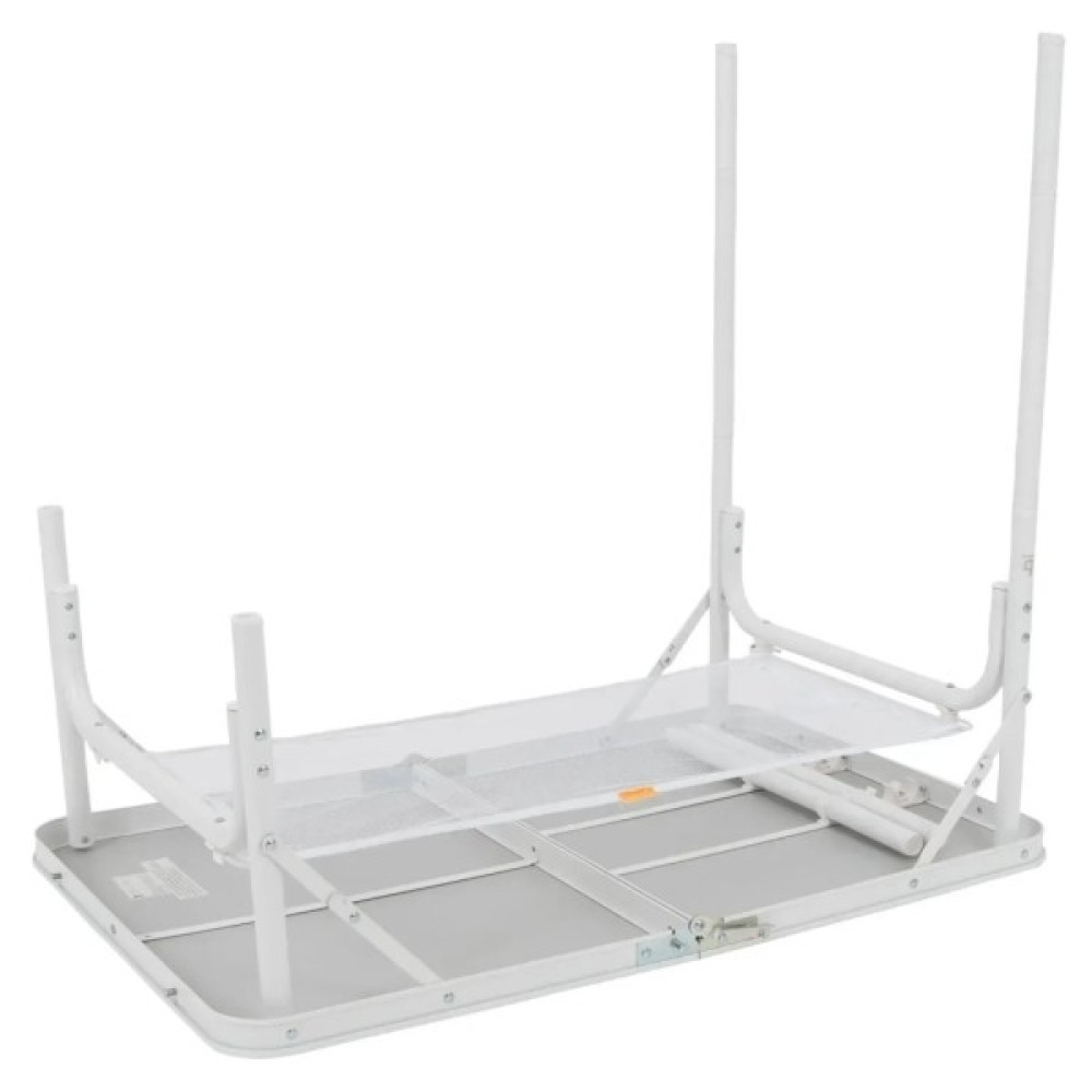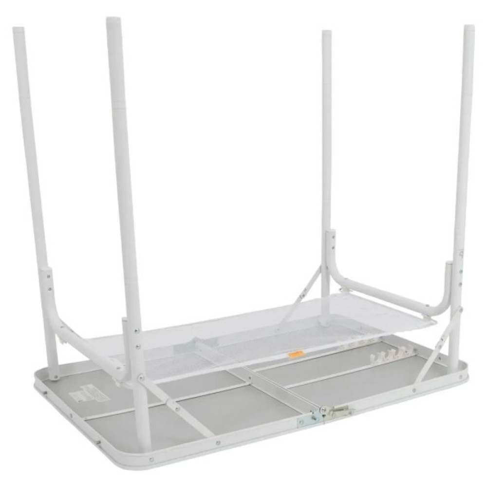 Ніжки з точним гвинтовим регулюванням легко виставляються навіть на нерівній поверхні. Стіл має складану стільницю та знімні ніжки, завдяки чому компактно складається у форму валізки (всього 60x45x7 см). Під стільницею передбачено сітчасту полицю для зберігання речей, а зручна ручка дозволяє легко переносити стіл.