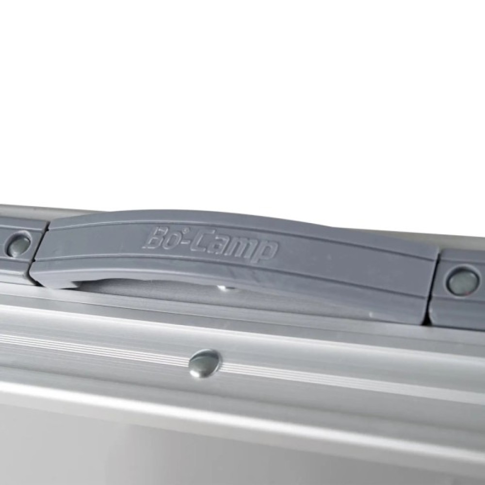 Bo-Camp Premium Oval можна дуже компактно зберігати і переносити у вигляді кейса, завдяки складній стільниці і ручці. У транспортному положенні стіл зафіксований чотирма замками, що запобігають мимовільному розкриттю.