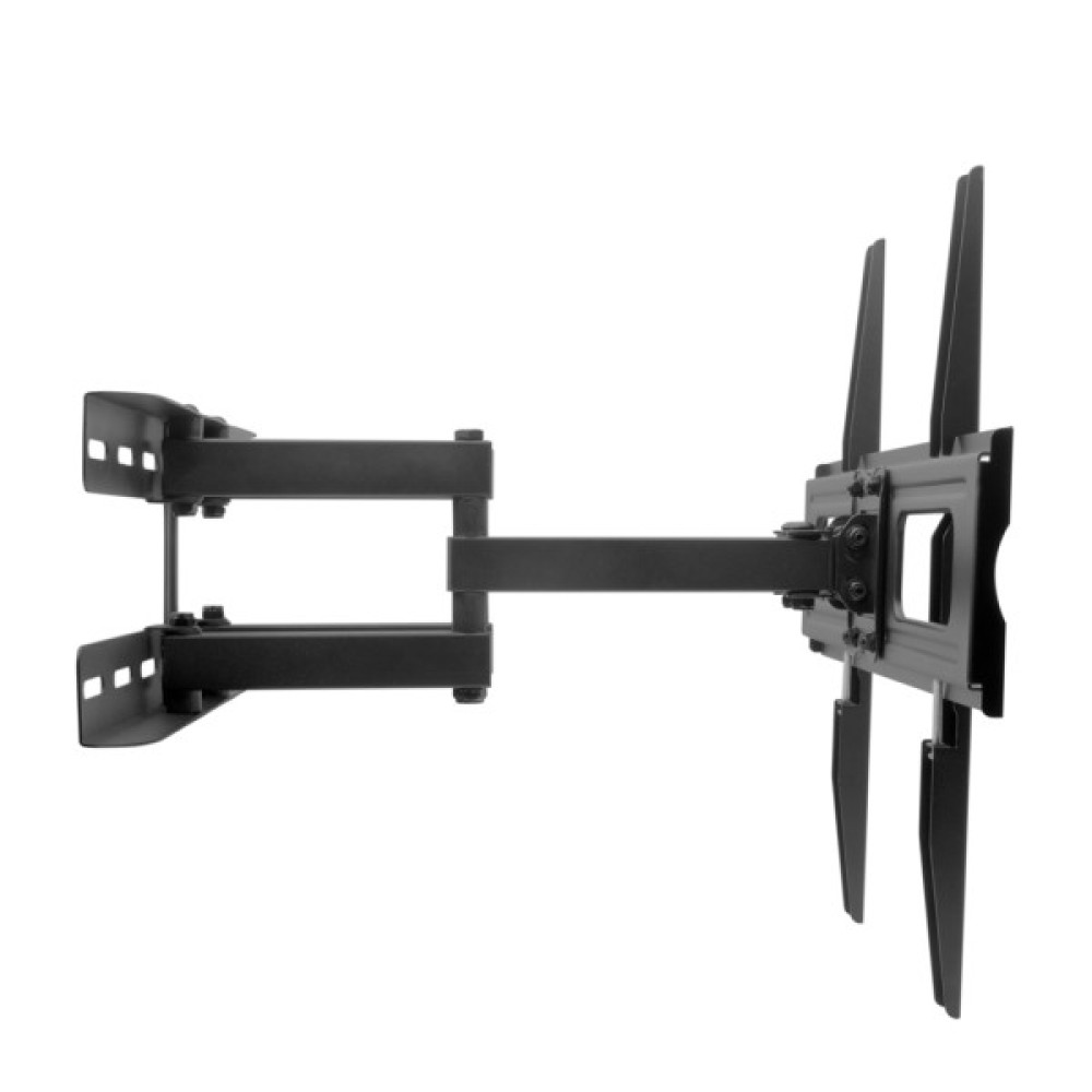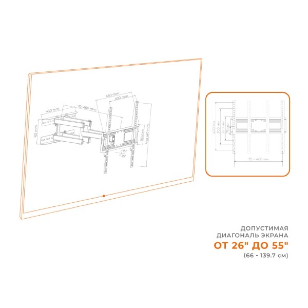 Тип кронштейна є поворотно-похилій, що дозволяє користувачам налаштовувати оптимальний кут огляду. Завдяки чотирьом ступеням свободи ви можете з легкістю змінювати положення телевізора у межах вертикального кута нахилу від 15° до -15° і горизонтального повороту до 90°. Це відкриває безліч можливостей для комфортного перегляду улюблених фільмів чи спортивних трансляцій з будь-якої точки кімнати.