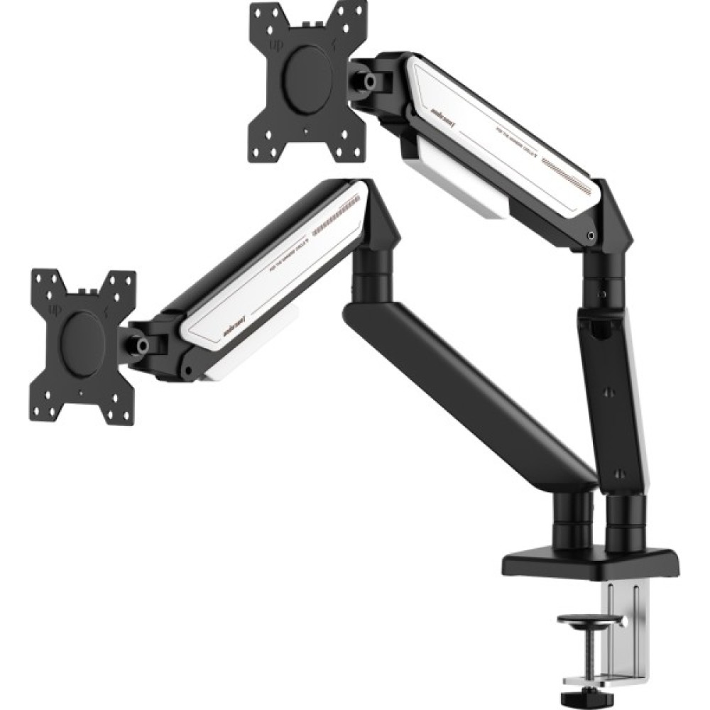 Максимальне навантаження до 9 кг на кожен із двох моніторів гарантує стабільність, а особливості кронштейна, такі як приховане укладання дротів, допомагають підтримувати порядок на робочому місці. Компактний і стильний дизайн в білому кольорі додає елегантності інтер'єру, а силіконові захисні накладки надійно захищають поверхню столу.