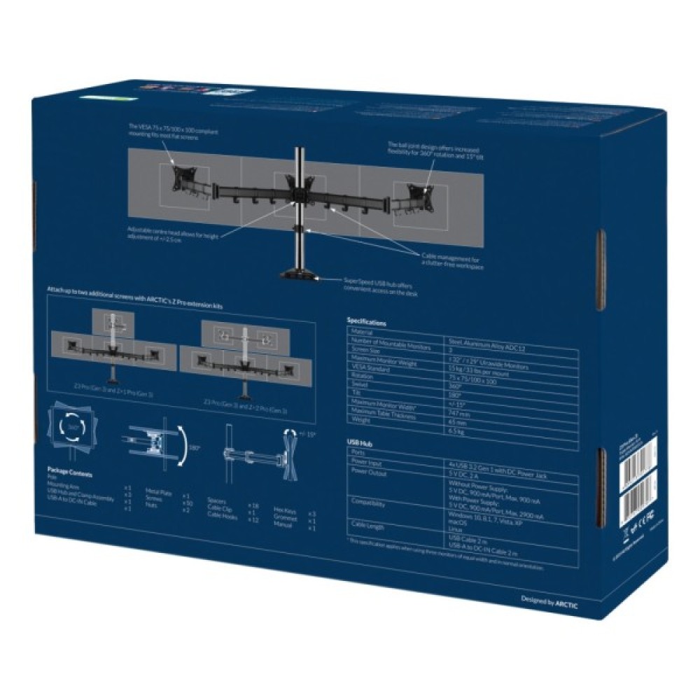 Кронштейн Arctic Z3 Pro (Gen3) (AEMNT00051A) – це ідеальне рішення для тих, хто прагне організувати свій робочий простір з максимальною ефективністю та комфортом. Цей поворотно-похилий тип кронштейна дозволяє легко налаштувати три екрани до потрібного кута огляду, максимально покращуючи ергономіку робочого місця. З максимальною підтримуваною діагоналлю до 32", ви можете встановити великі монітори, забезпечуючи собі приголомшливий візуальний досвід.