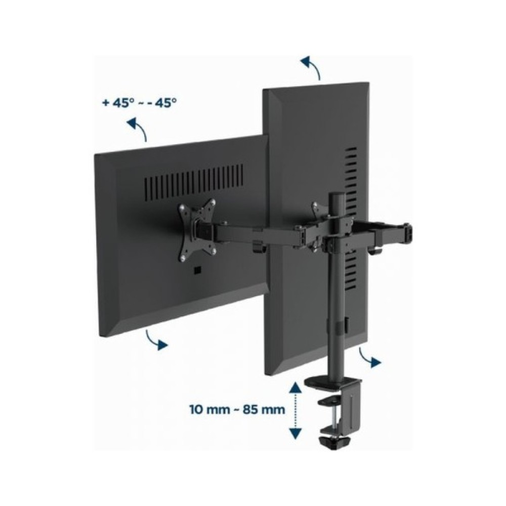 Завдяки трьом ступеням свободи, Gembird MA-D2-03 пропонує повну гнучкість та зручність. Ви можете легко обертати монітор на 90 градусів в обидві сторони, нахиляти його від +45 до -45 градусів, забезпечуючи максимально комфортне налаштування кута перегляду. Це особливо актуально для професіоналів, які працюють з графікою або потребують частої зміни орієнтації екрану.
