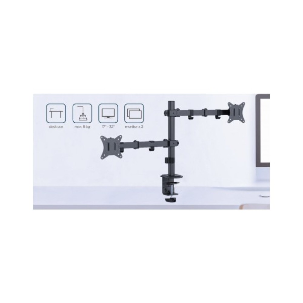 Основна унікальна перевага Gembird MA-D2-03 полягає у його здатності підтримувати широкий спектр діагоналей моніторів — від 17" до 32". Це означає, що ви можете використовувати його з різними моделями моніторів, знаючи, що кожен з них отримає надійну підтримку. Кронштейн здатний витримувати до 9 кг ваги на кожен монітор, що підвищує надійність і довговічність вашого обладнання.