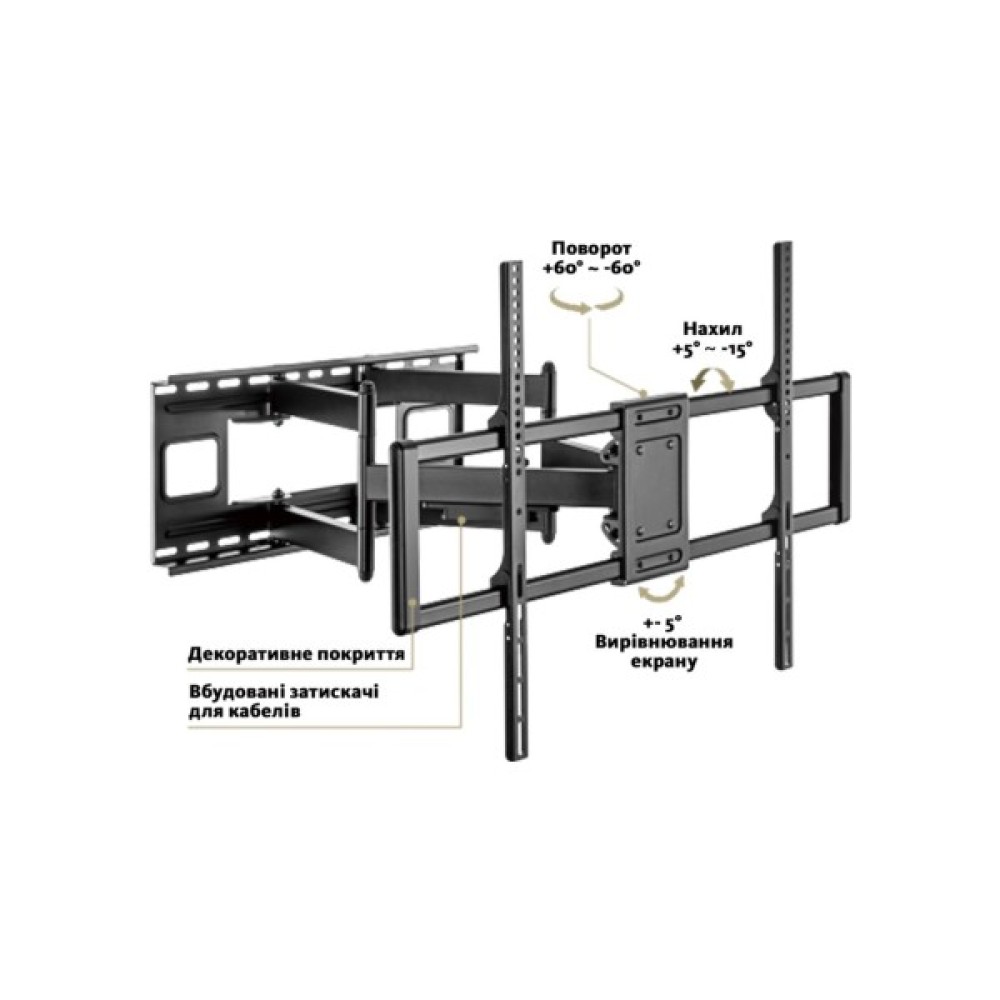 Кронштейн оснащено продуманою системою кабель-менеджменту, що дозволяє приховувати дроти та надає інтер'єру чистий і стильний вигляд. Це унікальне рішення зберігає естетику вашого приміщення та додає зручності у використанні пристрою.