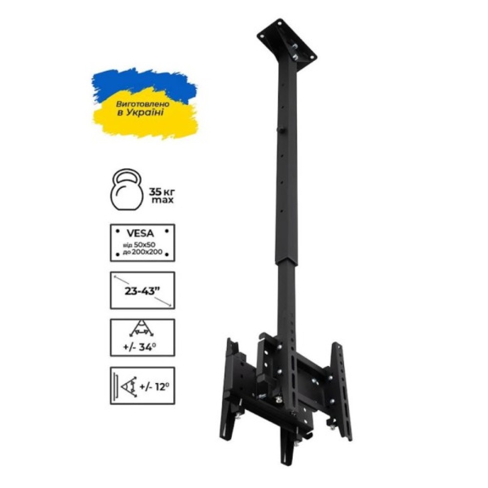 Стельове кріплення для телевізорів Sector СМ-202Т - це виріб, що поєднує в собі сучасні технології та естетичний дизайн, розроблений для безпечного і надійного монтажу двох телевізорів. Цей похилий кронштейн збільшує функціональність приміщення, дозволяючи закріпити екрани на стелі з діагоналлю від 23 до 43 дюймів.