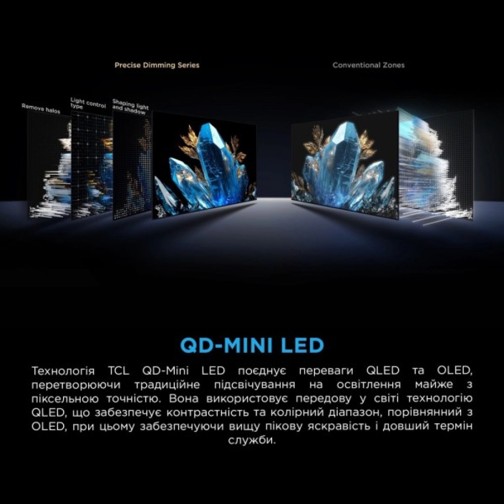 TCL 98C7K оснащений потужним процесором AiPQ Pro, який у реальному часі оптимізує якість зображення, налаштовуючи параметри для максимальної чіткості та яскравості. Mini LED підсвічування задіює технологію суперконденсованих мікролінз для точного контролю світла, що значно покращує якість перегляду, знижуючи ефект ореолу на зображенні.