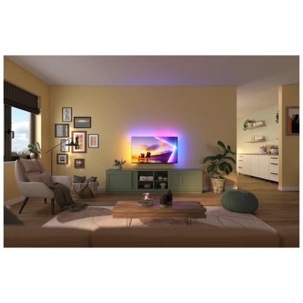 Технологія Ambilight перетворює ваш простір, проектуючи кольори на стіни навколо телевізора. Це створює ефект занурення і додає новий вимір до ваших улюблених фільмів і телепередач. Завдяки цій функції, перегляд стає дійсно захопливим процесом, який переносить вас у саме серце подій на екрані.