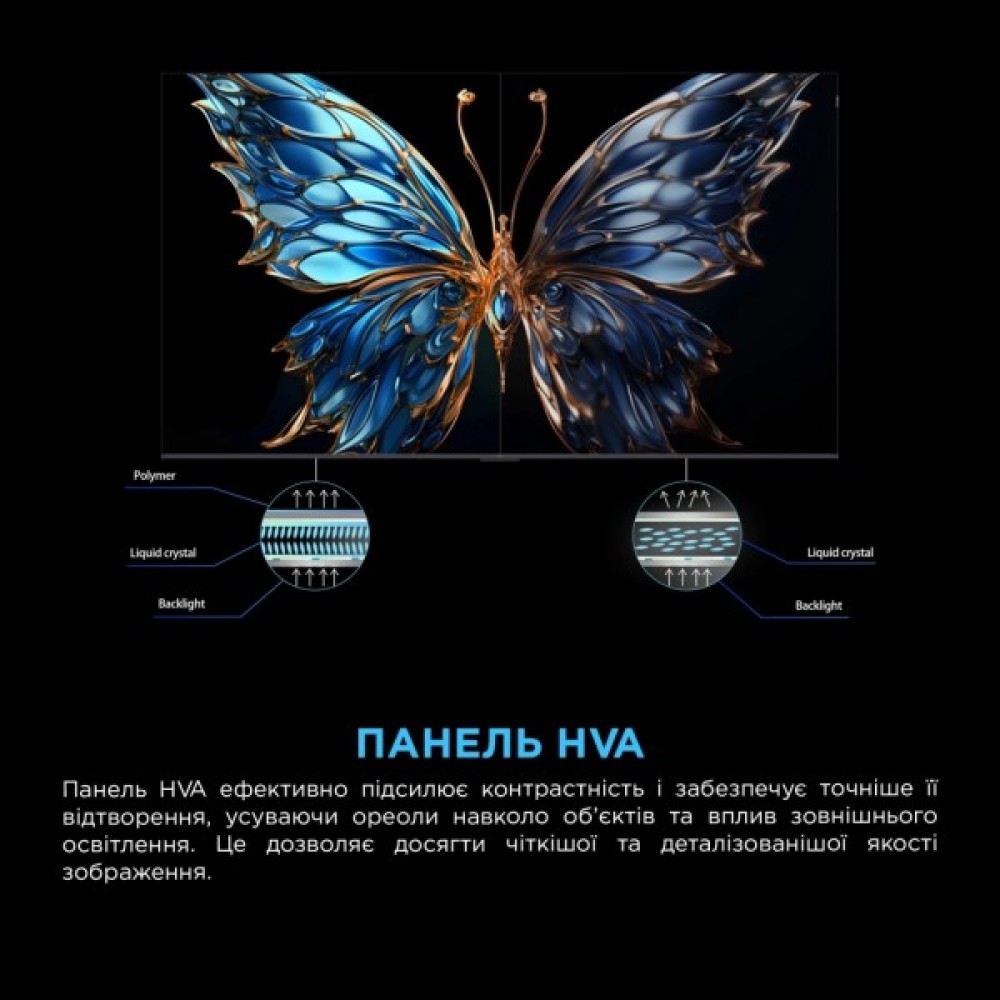 Телевізор підтримує технологію High Dynamic Range (HDR), що забезпечує яскраві кольори і глибокий контраст, доповнені технологіями покращення зображення, такими як HLG, HDR 10, Ai Clarity, Ai Color, Ai HDR та Ai Contrast. Це створює неймовірно реалістичну картинку, де кожен відтінок відображений з вражаючою точністю.