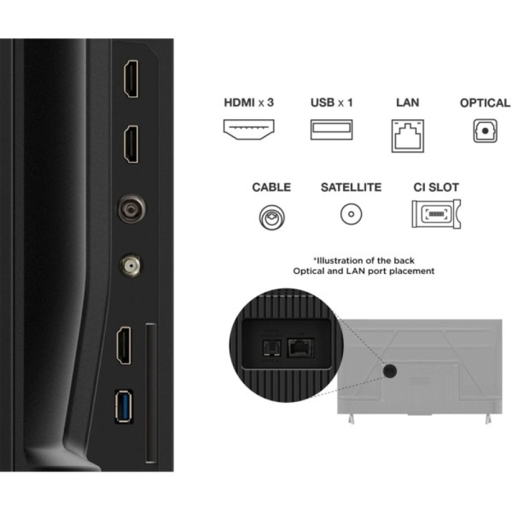 Інтерфейси підключення доповнені широким вибором портів: 1 x RJ-45, 3 x HDMI, CI, USB і 1 x оптичний аудіо, що спрощує підключення зовнішніх пристроїв, роблячи телевізор ідеальним мультимедійним центром для вашого дому.