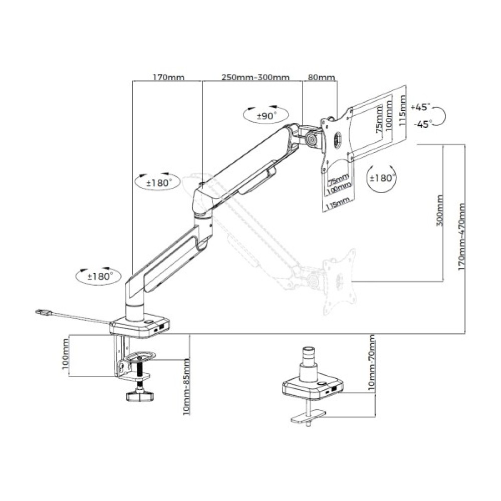 Цей поворотно-похилий кронштейн надає вам чотири ступені свободи, що дозволяє легко адаптувати положення вашого монітора під будь-які потреби. Завдяки куту нахилу від +45° до -45° та куту повороту від +90° до -90°, ви зможете зручно налаштувати екран для зменшення навантаження на очі та шию, що особливо важливо для тих, хто проводить багато часу за комп'ютером.