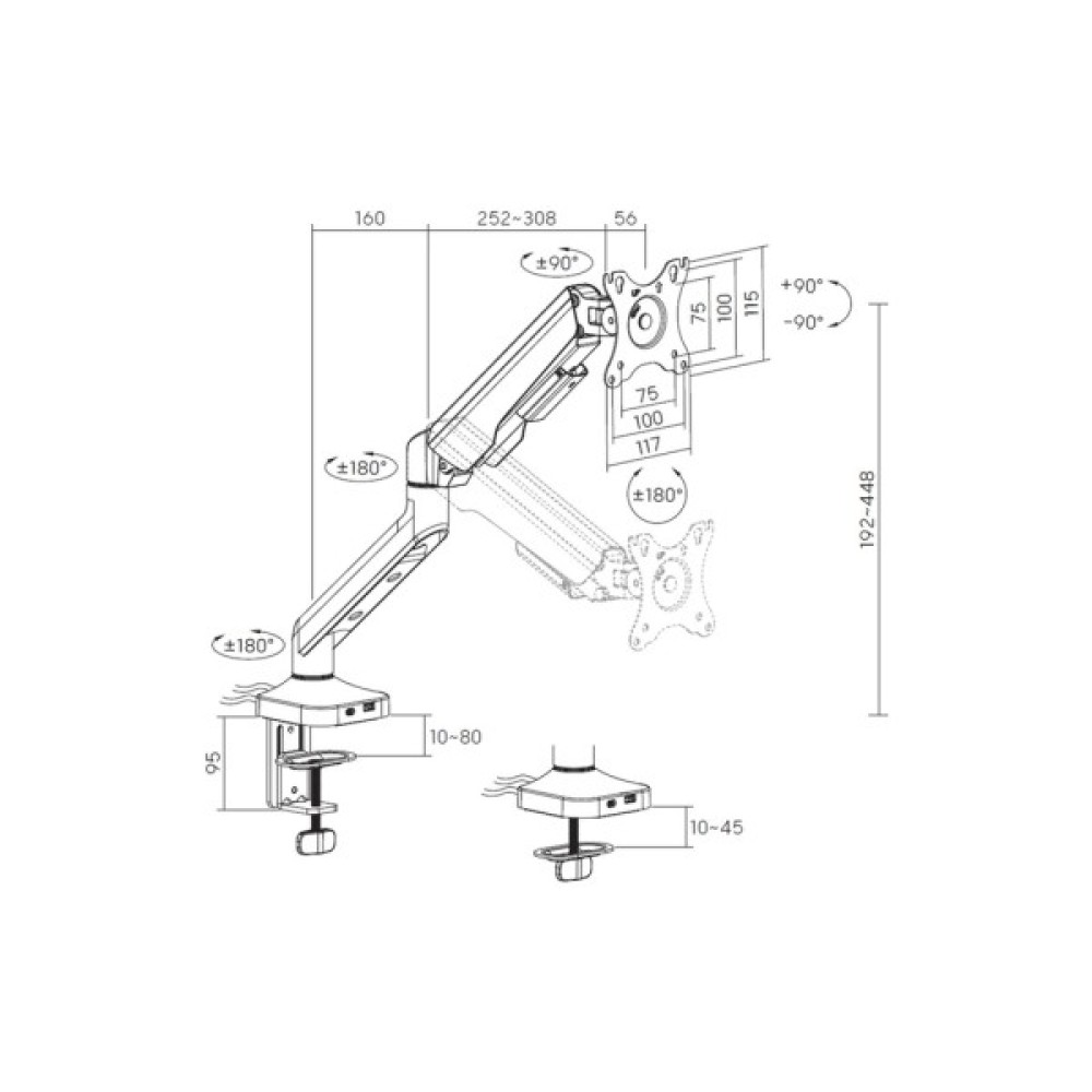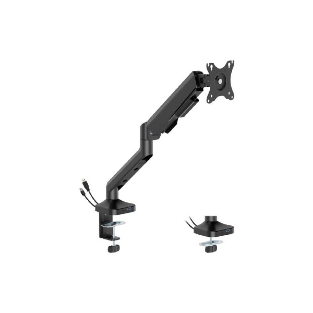 з регулюванням по висоті; для кріплення вигнутих екранів; з прихованим укладанням дротів; обертання: ±180°; з USB-концентратором; з регулюванням глибини; з портом USB-A; з портом USB-С