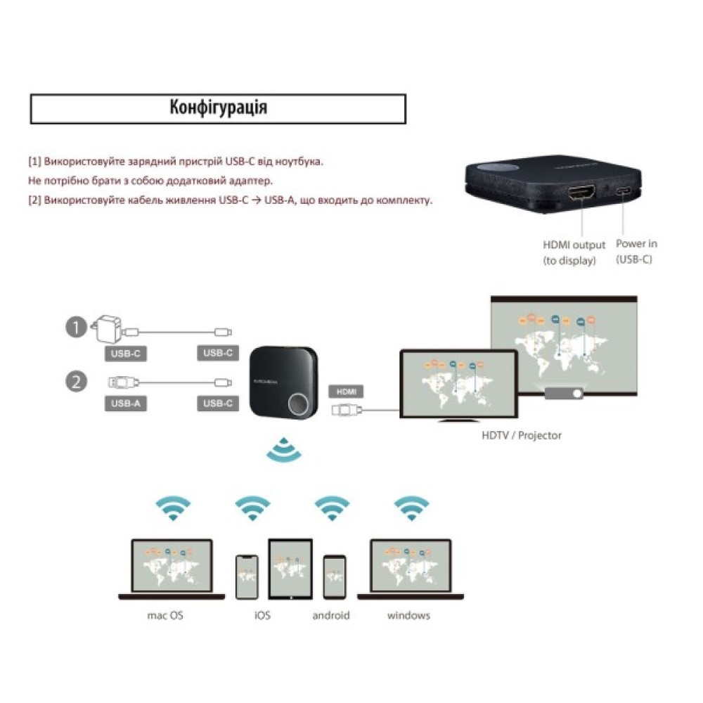 EVROMEDIA AirBridge — це бездротовий приймач зображення у форматі Full HD, який дозволяє відображати екран смартфона, ноутбука або планшета на телевізорі, моніторі чи проекторі без кабелів і додатків. Пристрій працює за принципом — достатньо підключити його до HDMI-входу екрана та подати живлення через USB. Після цього ви можете миттєво передавати зображення з пристроїв на Windows, macOS, Android або iOS.