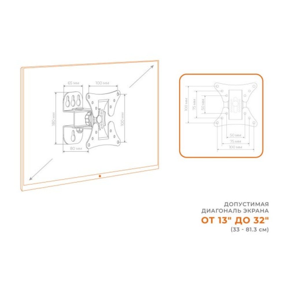 Призначений для телевізорів та моніторів, кронштейн підходить для різних діагоналей — від 15" до 32". Незалежно від розміру вашого екрану, ви зможете легко знайти оптимальне положення завдяки дворівневій системі свободи. Кут нахилу, що варіюється від -3° до -12°, дозволяє уникнути відблисків та забезпечити комфортний перегляд, тоді як кут повороту від -25° до 25° дасть можливість розташувати екран під ідеальним кутом, навіть якщо кімната має нетипове планування.