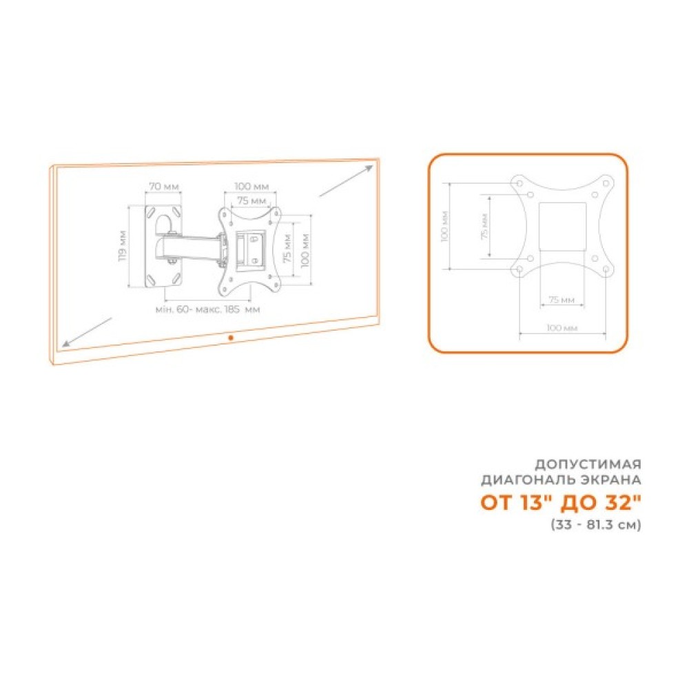 Основна перевага цього кронштейну полягає у його поворотно-похилому типі, що забезпечує дві ступені свободи. Це дозволяє вам знайти ідеальний кут для перегляду улюблених фільмів або роботи за монітором. Можливість регулювання кута нахилу в межах 3° до -12°, а також кута повороту від 90° до -90° гарантує максимальний комфорт і знижує навантаження на очі.