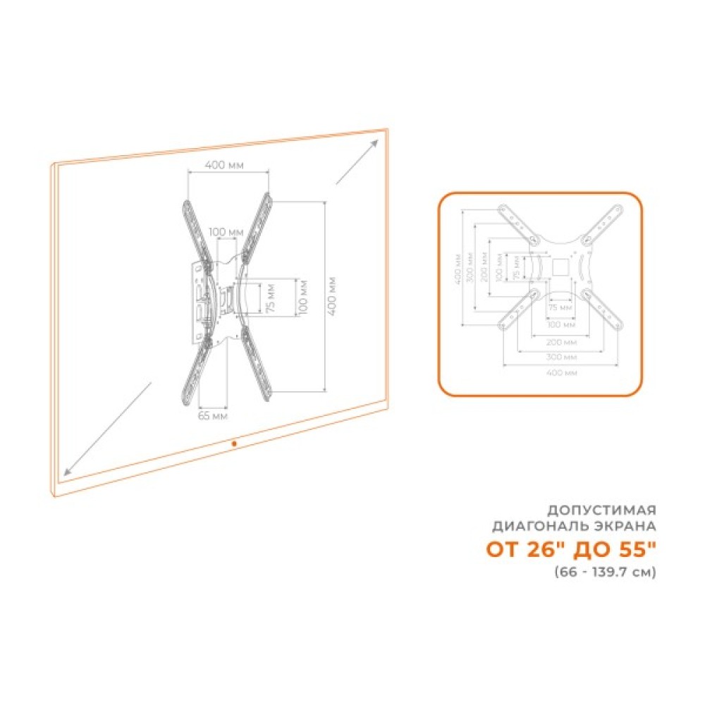 Завдяки своїй конструкції, ACCLAB AL-BT400 легко впорається з телевізорами з діагоналлю від 26" до 55", включаючи популярні моделі з розмірами екранів 31.5", 40", 47", 50", 52" та багато інших. Максимальна підтримувана вага становить 30 кг, що гарантує безпечне встановлення навіть важких телевізорів. Кронштейн відповідає стандартам VESA, підтримуючи розміри від 75 x 75 до 400 x 400, що робить його вкрай універсальним.