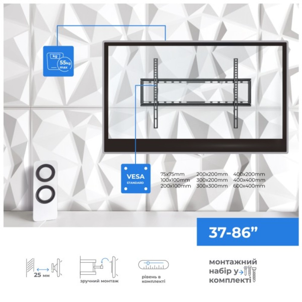 Кронштейн підтримує VESA стандарти: 75x75 мм, 100x100 мм, 200x100 мм, 200x200 мм, 300x200 мм, 300x300 мм, 400x200 мм, 400x400 мм, 600x400 мм, що забезпечує можливість встановлення практично будь-якого сучасного телевізора.