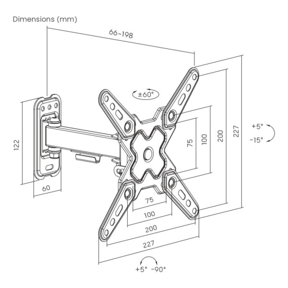 Для сумісності з різними моделями телевізорів кронштейн включає варіанти VESA монтажу: 100 x 100, 75 x 75, 200 x 100, 200 x 200 та 100 x 200. Це забезпечує широкі можливості підключення кріплення до телевізора, незалежно від виробника або моделі.